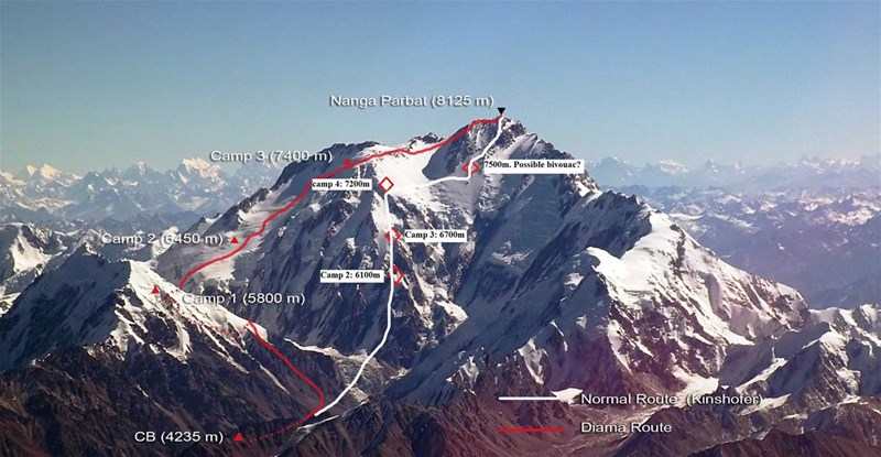 Французите Yannick Graziani и Hélias Millerioux и испанеца Ferran Latorre, пробвали нов маршрут на Нанга Парбат (означен с червено на снимката по-долу), без помощта на височинни носачи, са достигнали 300 м под върха, но се е наложило да се върнат, поради твърде силен вятър.