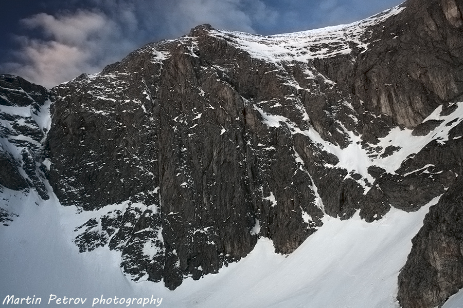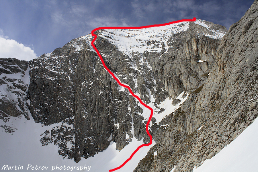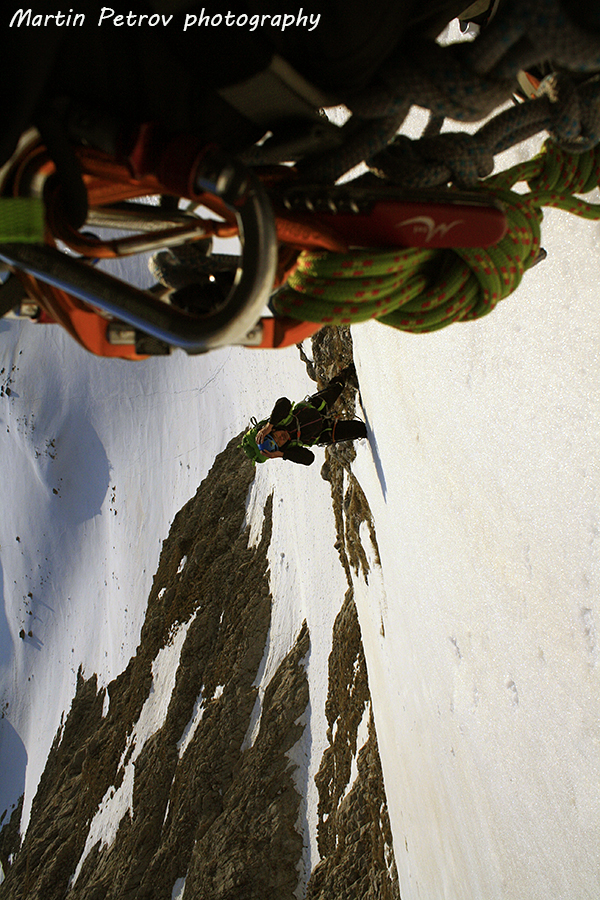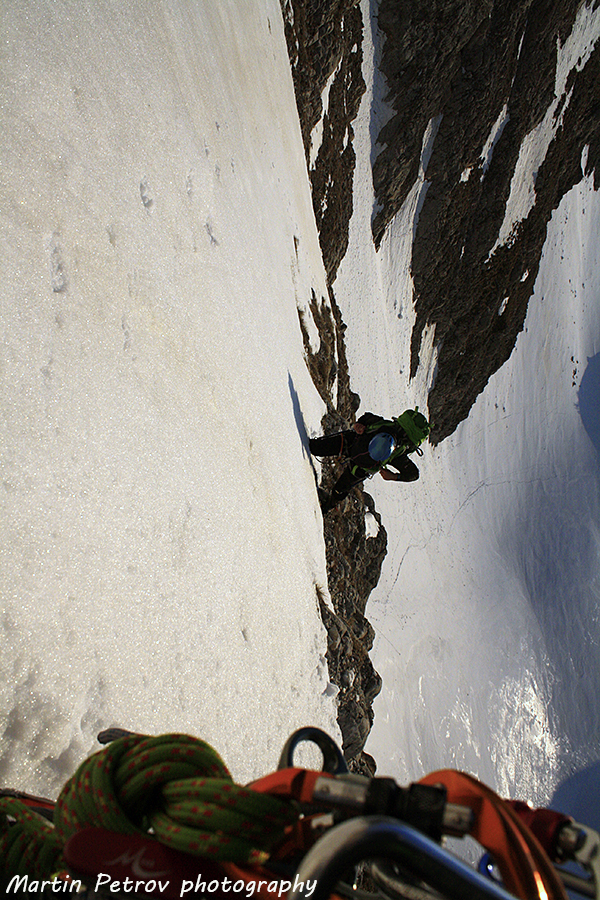 Кулоарът е класика, но е добре да се прави с втори и осигуровка през цялото време! Не напразно съм споделил да не се правят подобни изпълнения в стил соло. В случая снегът и условията позволяваха. Има клинове на проблемните у-ци, трябват и примки, клеми... Замислям го отново само да се стабилизира времето!