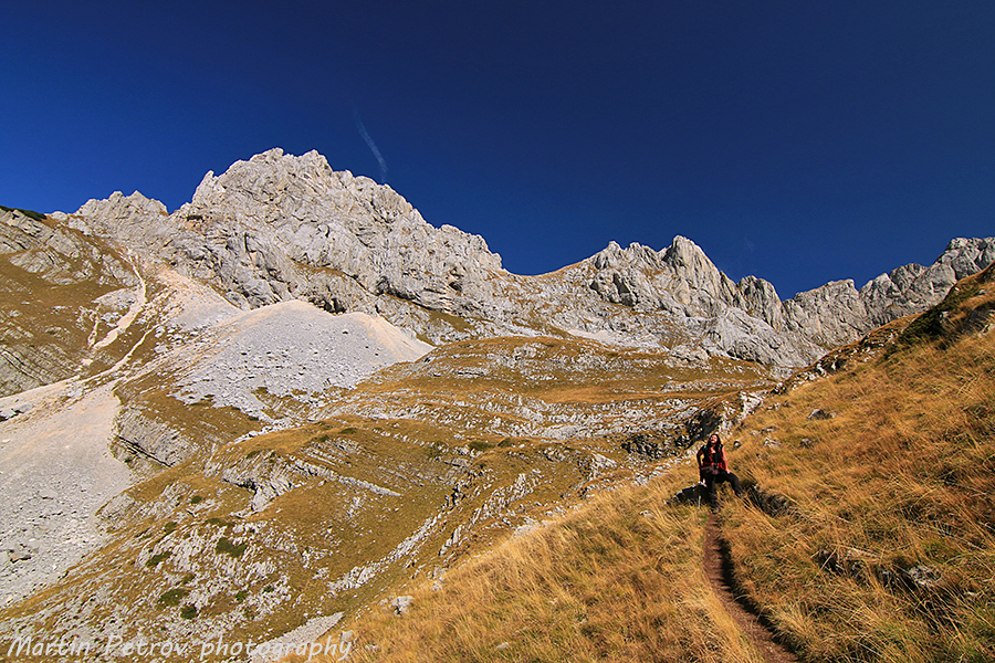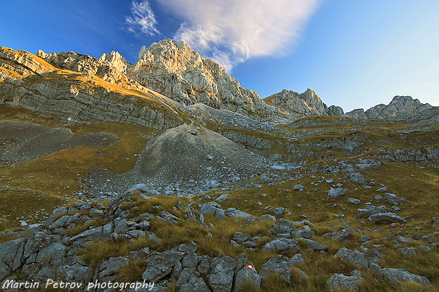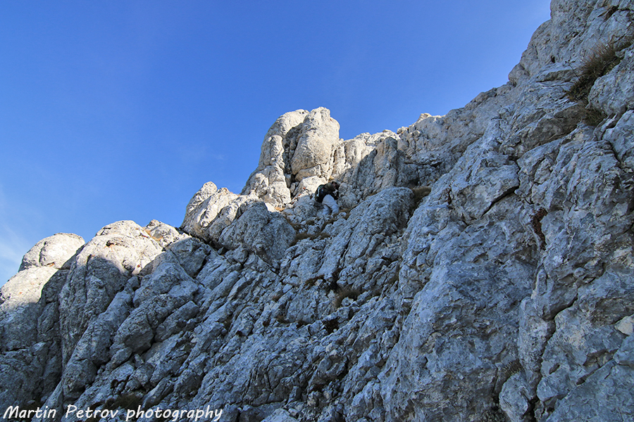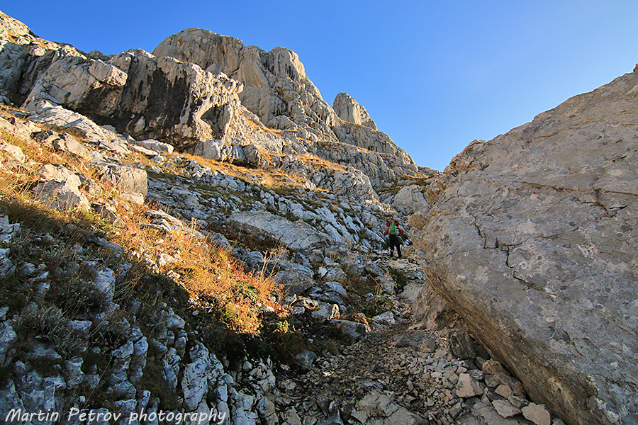 Скоро слънчевите лъчи се отразяват ефектно в скалите над нас. Денят по прогноза беше прекрасен, прохладен и безветрен. Вървейки по пътеката, усещах, че все пак има шанс да се изкача до котата на върха, въпреки неимоверните усилия от моя страна.