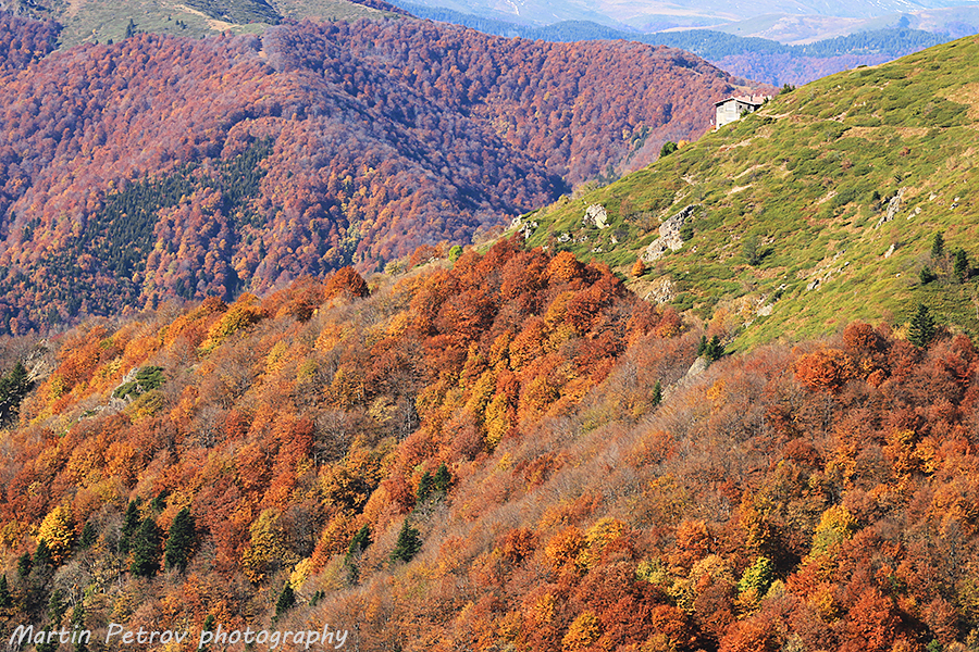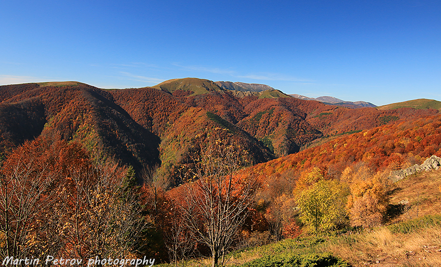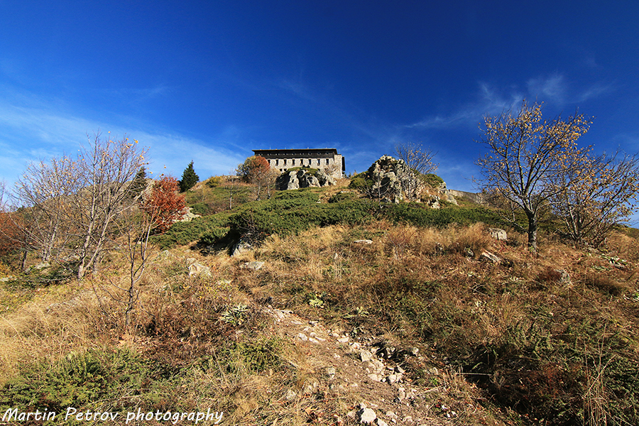 На хижата постоях половин час, колкото да се полюбувам на есенните простори и хубавото време. След което тръгнах на изток по пътеката КЕ към паметника на Петко Дачев, който се намира в седловина, наречена Ветровити преслап. Интересно е да се спомене, че край седловината са разположени върхове със странни имена на животни - Кучето (1660 м.), Котето (1630 м.), както и че склоновете, около тези върхове са силно лавиноопасни през зимата. Тук, от върха на планината се отделя маркирана пътека, която се спуска на север към курортното село Чифлик и близката до него хижа Хайдушка песен. Продължавайки на изток, точно след няколко минути се отделя маркирана в жълто-червено туристическа пътека на юг, по която се следва рид Боба за слизане в Христо Даново. Пътеката за КЕ изкачва рязко и стръмно по коловата маркировка, следвайки билото на Стара планина. Рид Боба следва античното римско трасе на античния друм. По източните склонове на рид Боба са разположени останките на каменна кошара - Боба мандра, край които е изградена чешма. Сгреших и не допълних почти празните си шишета, което се оказа голяма грешка в последствие, предвид очакващите ме 12 км до колата. За деня бях изпил, около 1.5 л. вода, оказаха се недостатъчно. Обикновено нося по 2.5 л. и връщам половината, но този път подцених нелекия преход. Имената на рида, потока, мандрата Боба са в превод от Бащин камък, Бащин дол и т.н. от турската дума боба/баба - баща. В някои случаи значението на думата е светец, както е например при Бабска река под връх Голям Кадемлия.