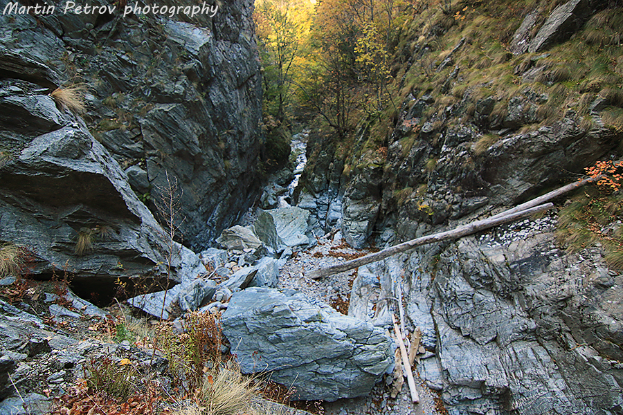 Не се стърпях на едно място, там където водата пропада и дерето в горната си част остава сухо, че слязох да разгледам. Ясно се вижда разликата между сухата част и тази с водата, която се губи и после пак намира пътя. Участъкът се намира непосредствено преди бариерата на Национален парк Централен Балкан.