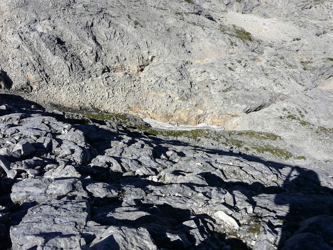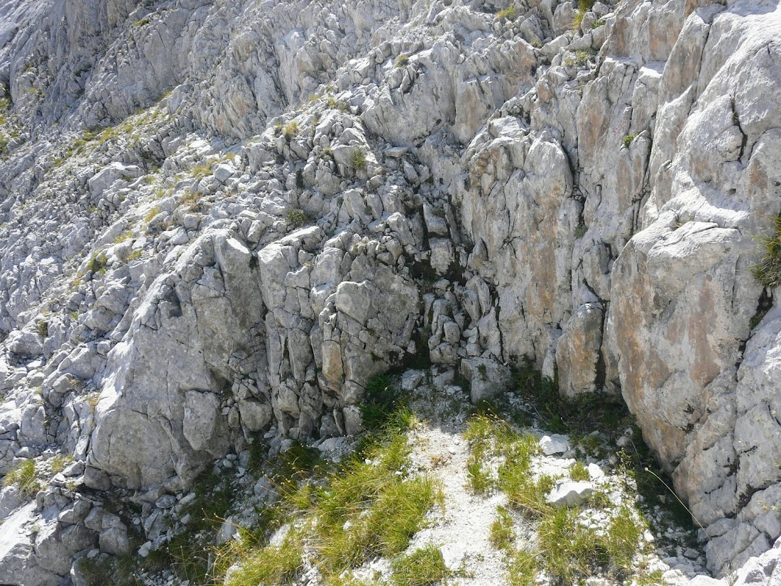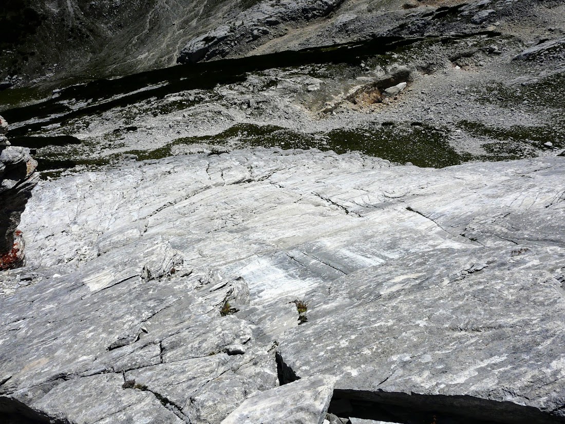 Сега преминах вляво по ръба на процепа, на горната снимка. Вътре в самият процеп не става за ходене, камъните са живи, както много сполучливо ги определя Иван Динков-(Проклетиев), и с много остри ръбове. И да няма свличане, достатъчно е някой камик да се обърне и те удари по кунките.