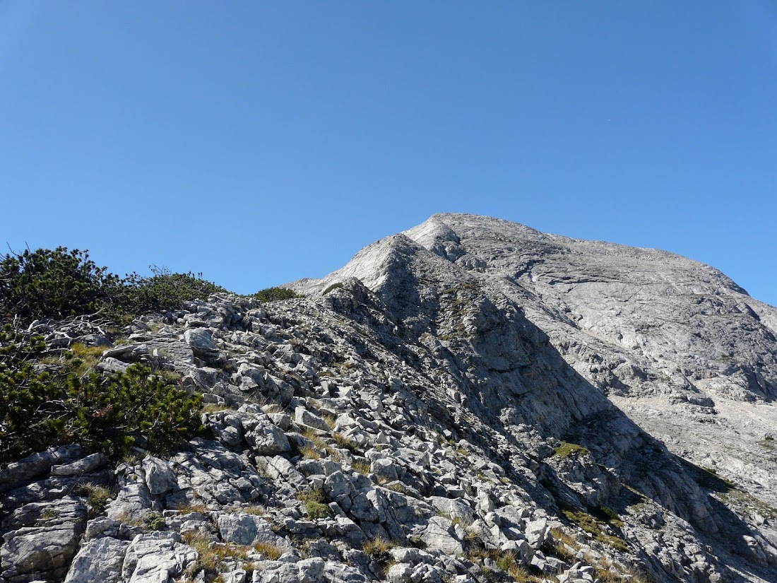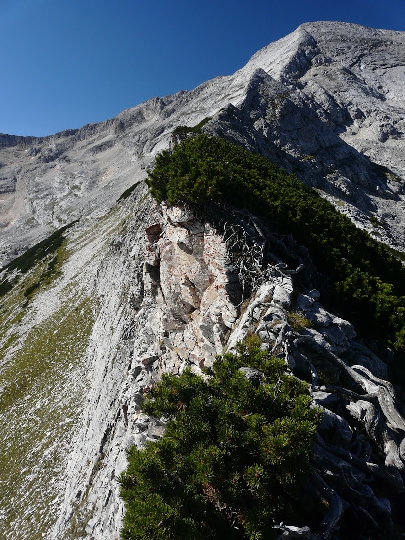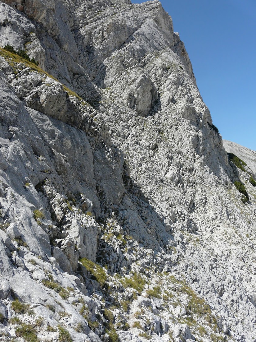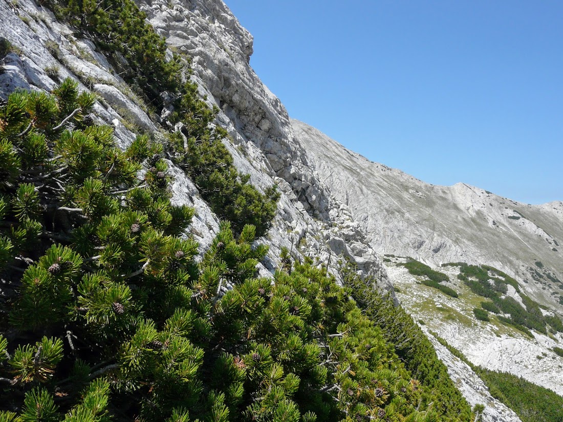 Този път решавам, за разлика от преди месец, да следвам друго, по-високо разклонение на козята пътека. То забива в много стръмният ръб на Източната стража. През един ситен и лесен за преминаване клек, който тук даже помага да се задържаш на големият наклон, пътечката на козите е незабележима, по средата на фотката: