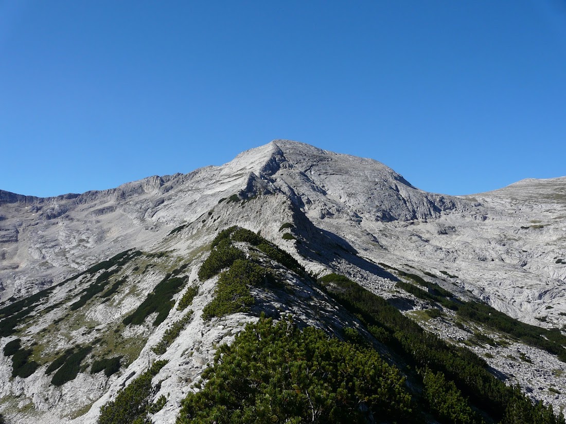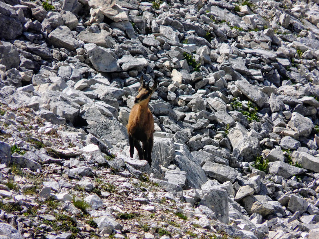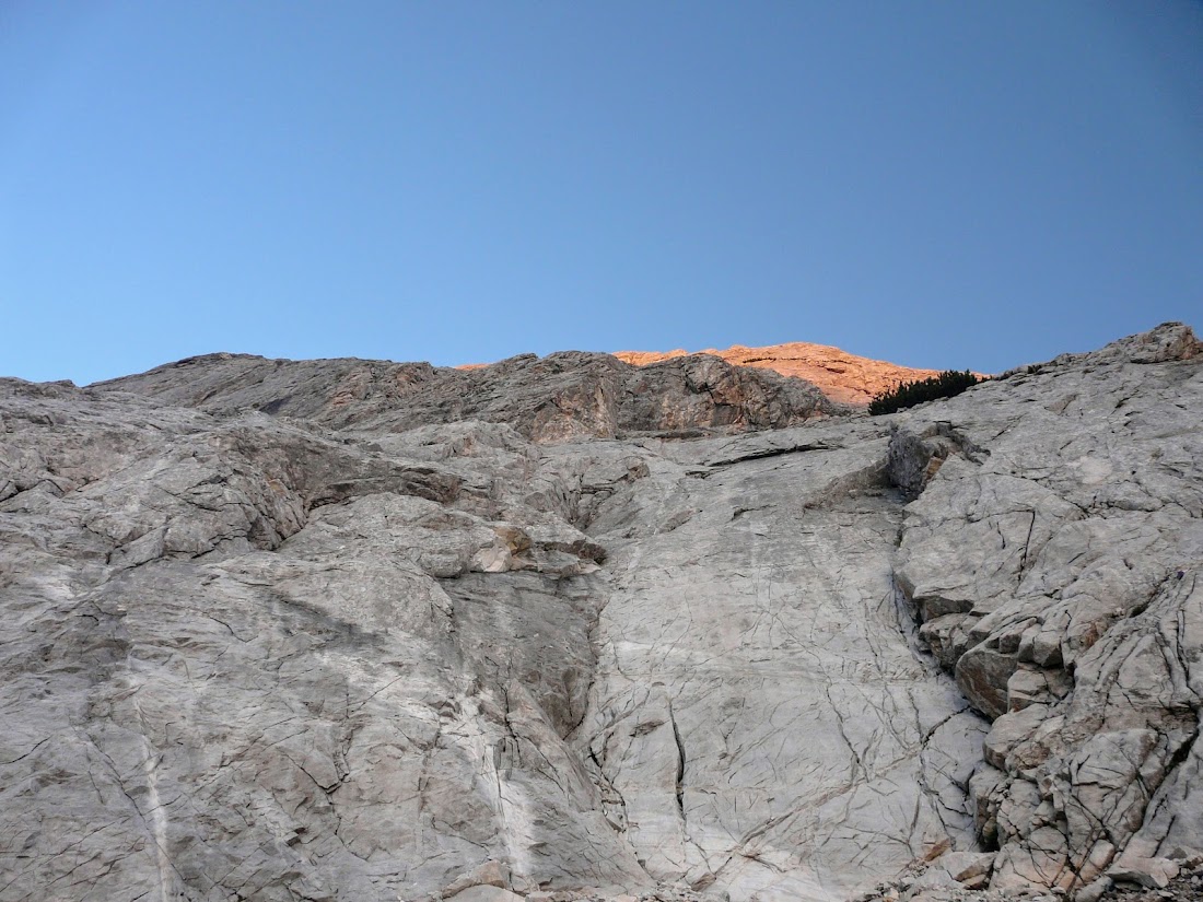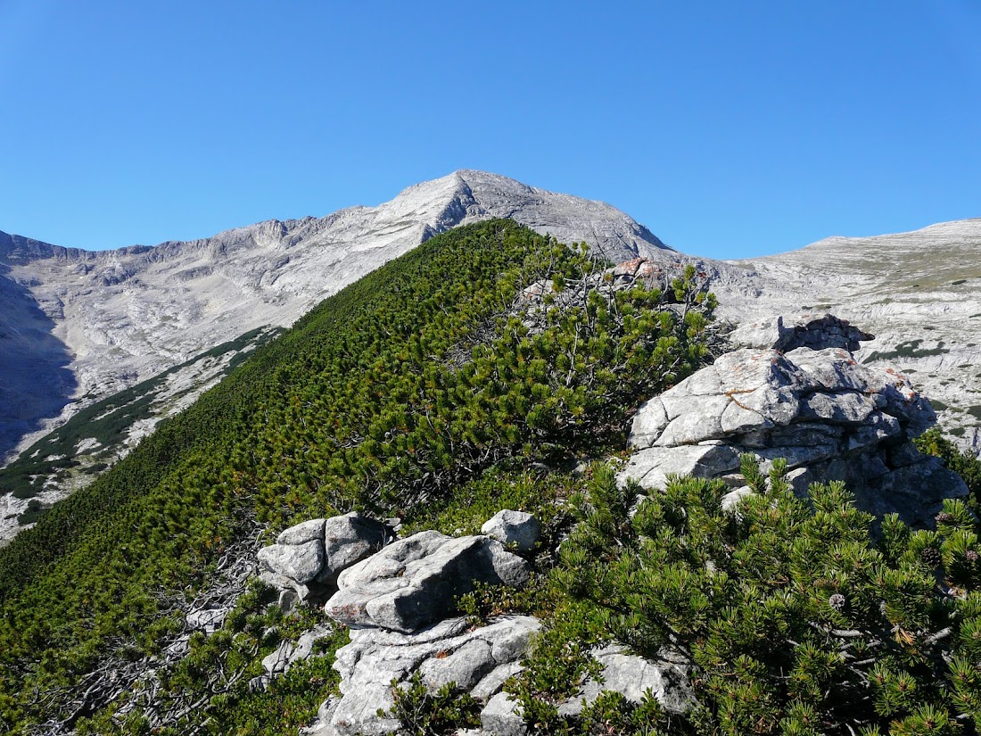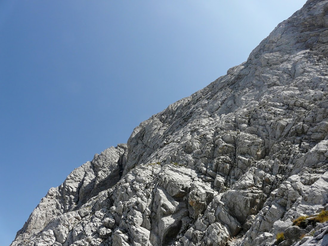 Този път решавам, за разлика от преди месец, да следвам друго, по-високо разклонение на козята пътека. То забива в много стръмният ръб на Източната стража. През един ситен и лесен за преминаване клек, който тук даже помага да се задържаш на големият наклон, пътечката на козите е незабележима, по средата на фотката:
