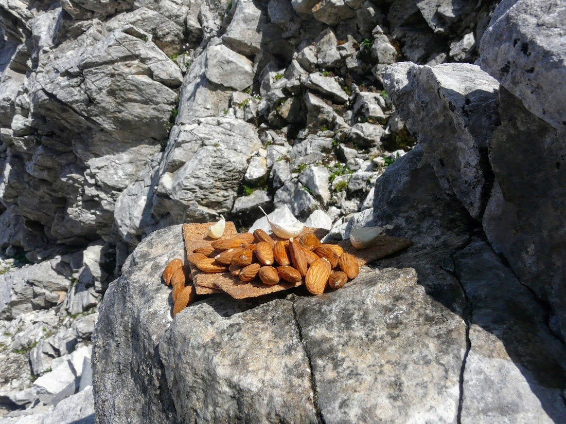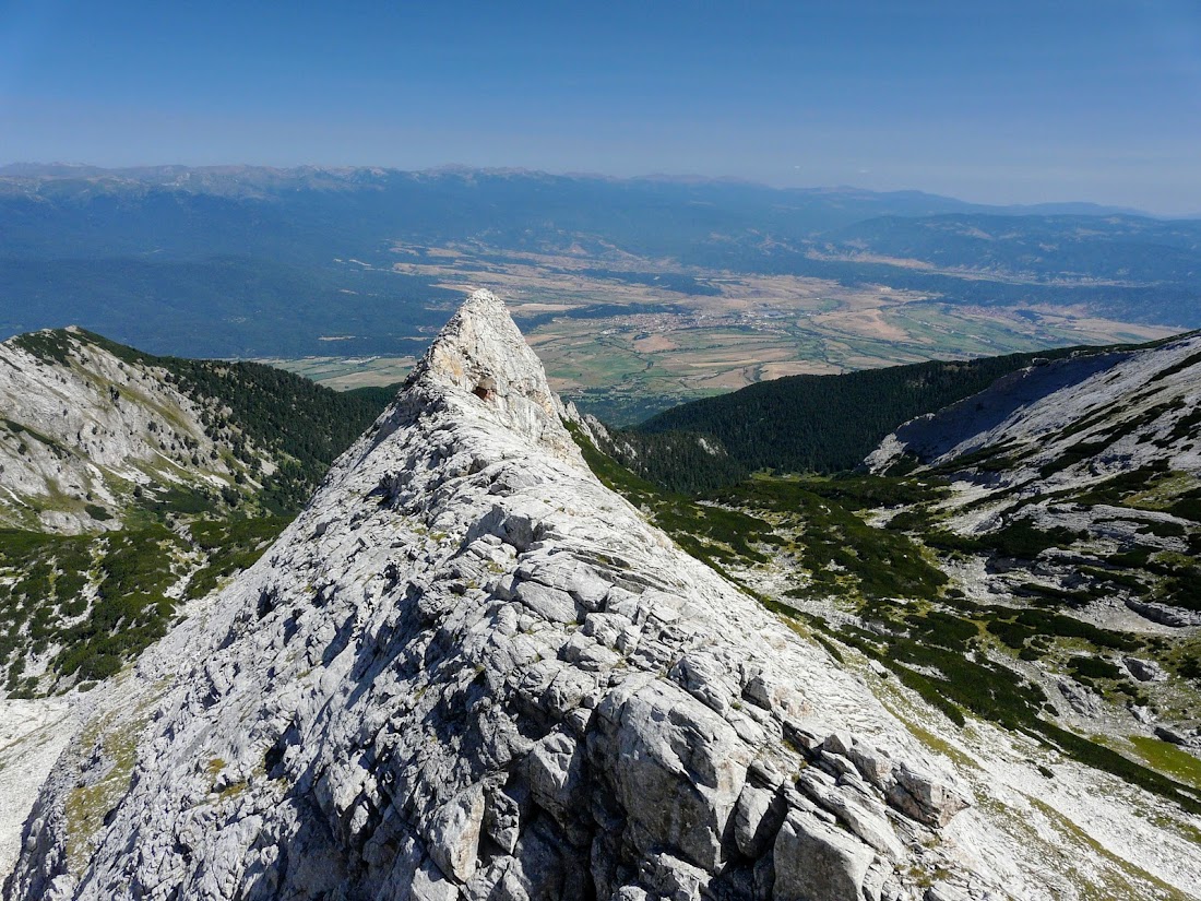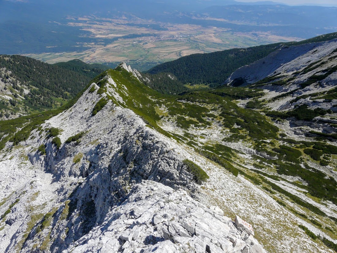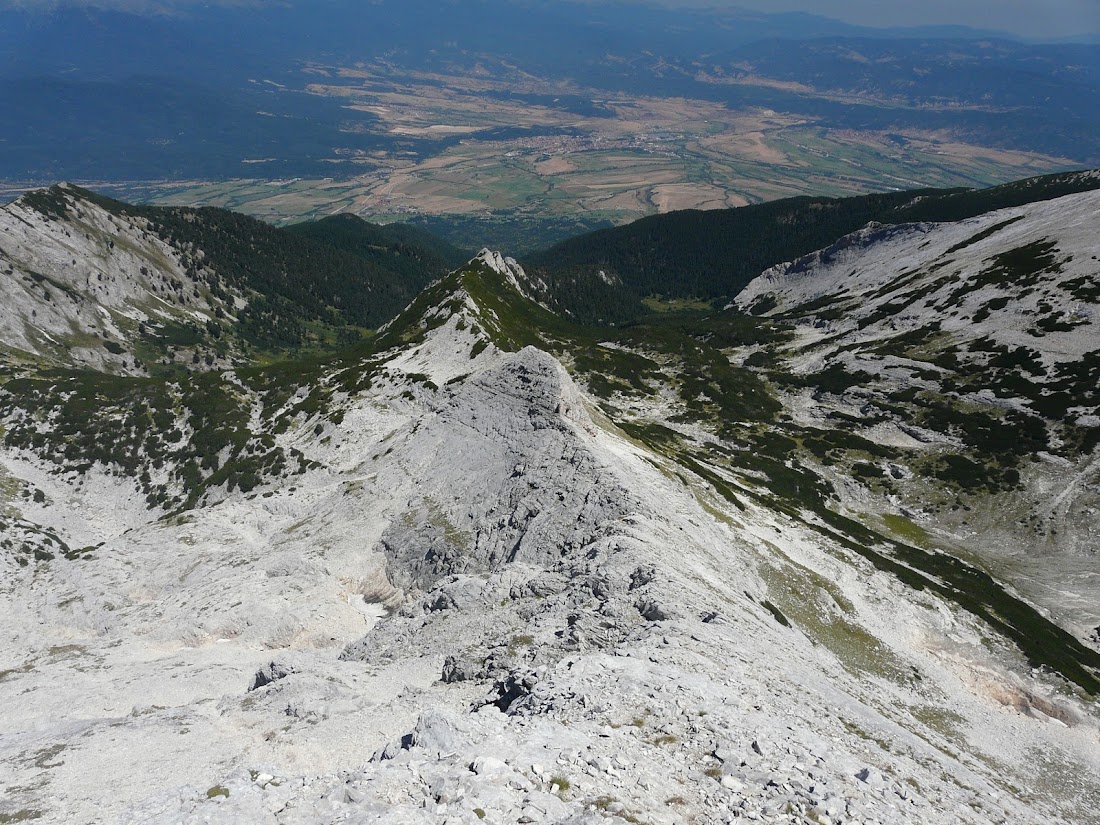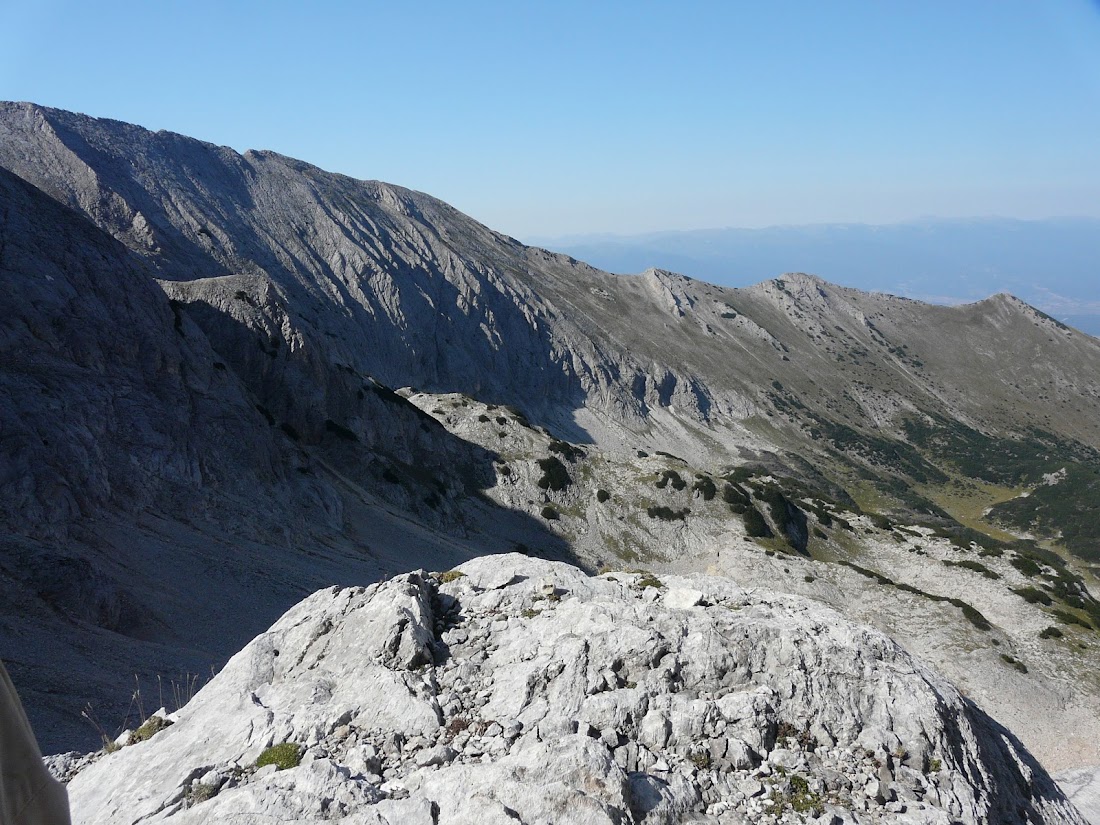 Първо се наложи малко слизане, после изкачване до един уединен връх, отделен от стената на Кутело, който е точно над Снежника. Много интересно и приятно място. Колкото трудно беше да се достигне върха му, толкова отгоре пък за награда е равно като балкон, изнесен много пред стената, та няма опасност някой падащ камък да те нацели. При преминаването ми през големият процеп преди месец, много внимавах да спирам само под надвеси, където има някаква защита.