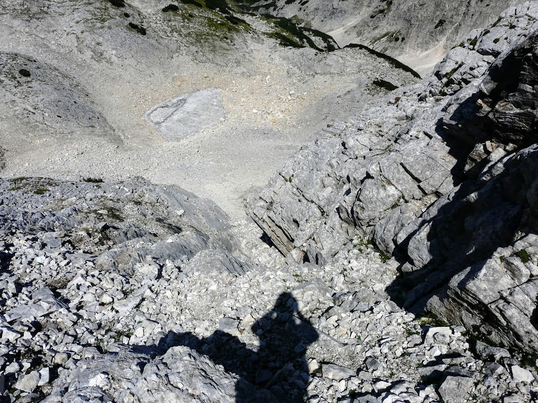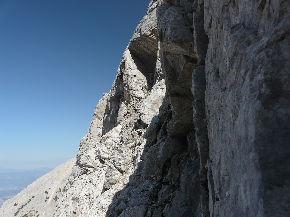 Поглед надолу, по новото трасе излизам на Големият процеп на Кутело, надолу е неговата първа третина. Това е и най-трудната част - началото му, освен оня Траверс на Боговете точно в средата на пропастта над снежника. По тия настръхнали скали вдясно на снимката беше първото изкачване: