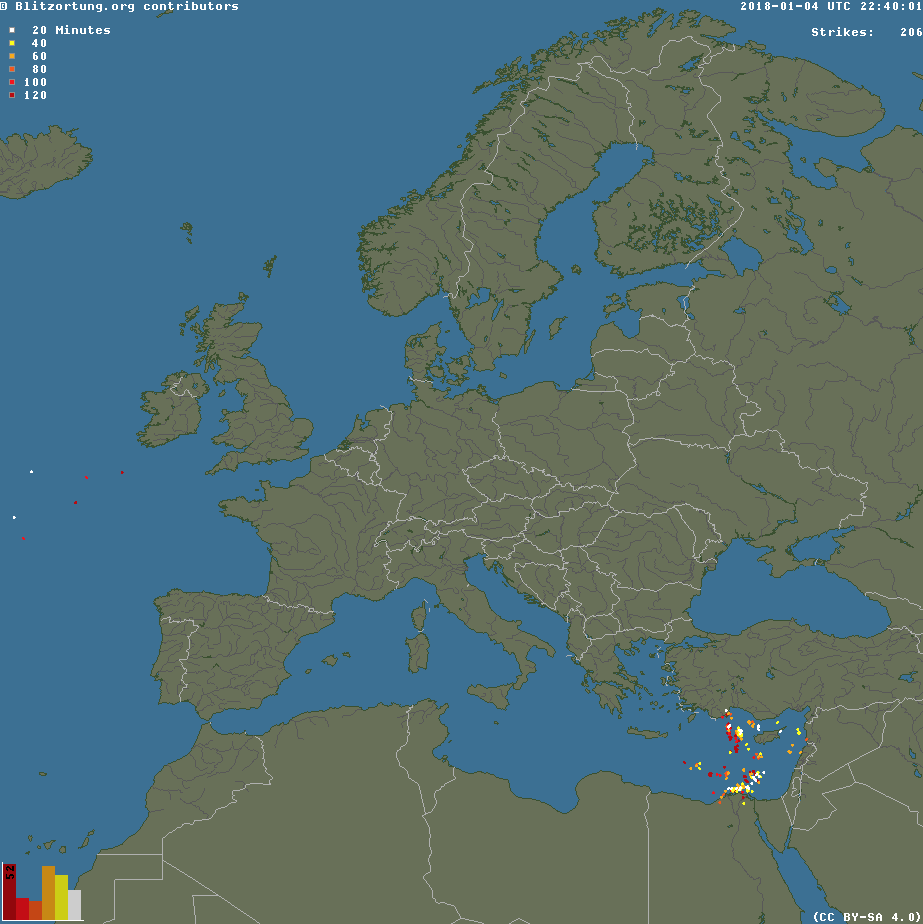 Погледнах данните от Network for Lightning and Thunderstorms in Real Time и установих, че точно сега (около момента, в който бе засечено последното събитие от гайгеровия брояч, което споменах по-горе) има сериозна гръмотевична дейност в близост до България, във връзка с преминаващия южно от страната средиземноморски циклон "Албена":