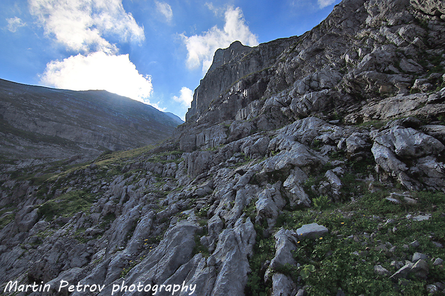 Вальо и Жоро ме следват по осеяните с цветя тревни площи, които са кът тук. Насреща е стената на връх Зла Колата. Маркировката на места се губи и трябва да се внимава повече.