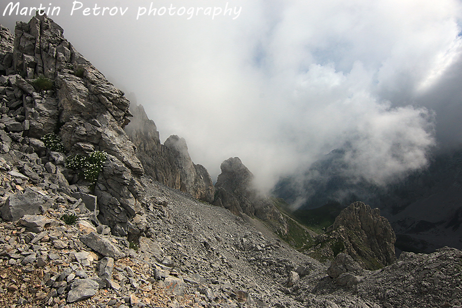 В мъгла и силен вятър се изкачваме до котата на Васоевички Ком - 2460 м.н.в.. Нямахме късмет с времето в този ден, за да зърнем отвесните стени на върха и панорамните гледки към първенеца Кучки Ком, но това ще е компенсирано с гледките в Проклетия в следващите няколко дни!