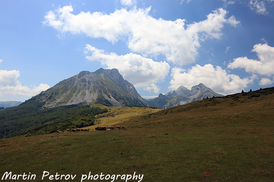 Васоевички Ком вляво и Кучки Ком вдясно. Димо зарежда батериите с боровинки, а Катя ни чака в близост до изходната точка. Наоколо е пълно с нови и по-стари къщи за гости. Всичко е уредено и чисто, прекрасно място за туризъм за всички. По-амбициозните може да се пробват за ден да изкачат двата първенеца на планината, което щеше да ни дойде тежичко, след пътя предния ден с колата, а и имахме нужда да си починем на поляната от първите снимки. Прокрадваха ми се мисли за проба, но слънцето проби сериозно по обяд и мързелът надделя. Заложихме се на една крайпътна и сенчеста чешма, където охладихме цял куп бири... Останалите, които нямат намерения за преходи в планината, се възползват от поляните и приказните панорами. Стада с коне, крави и овце се разхождат наоколо...