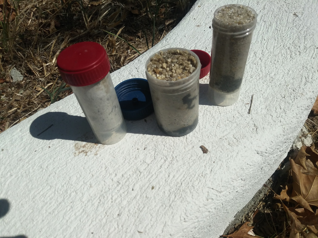 Черните "петна" са там където още има влага...първоначално, цялата "проба" има такъв черен цвят. Та пясъчните проби, не мога да ги суша като хората, защото после няма да се съберат в контейнерчето, трябва да ги суша докато са вътре и това е много бавно. Така като гледам ще им трябва поне седмица слънце.