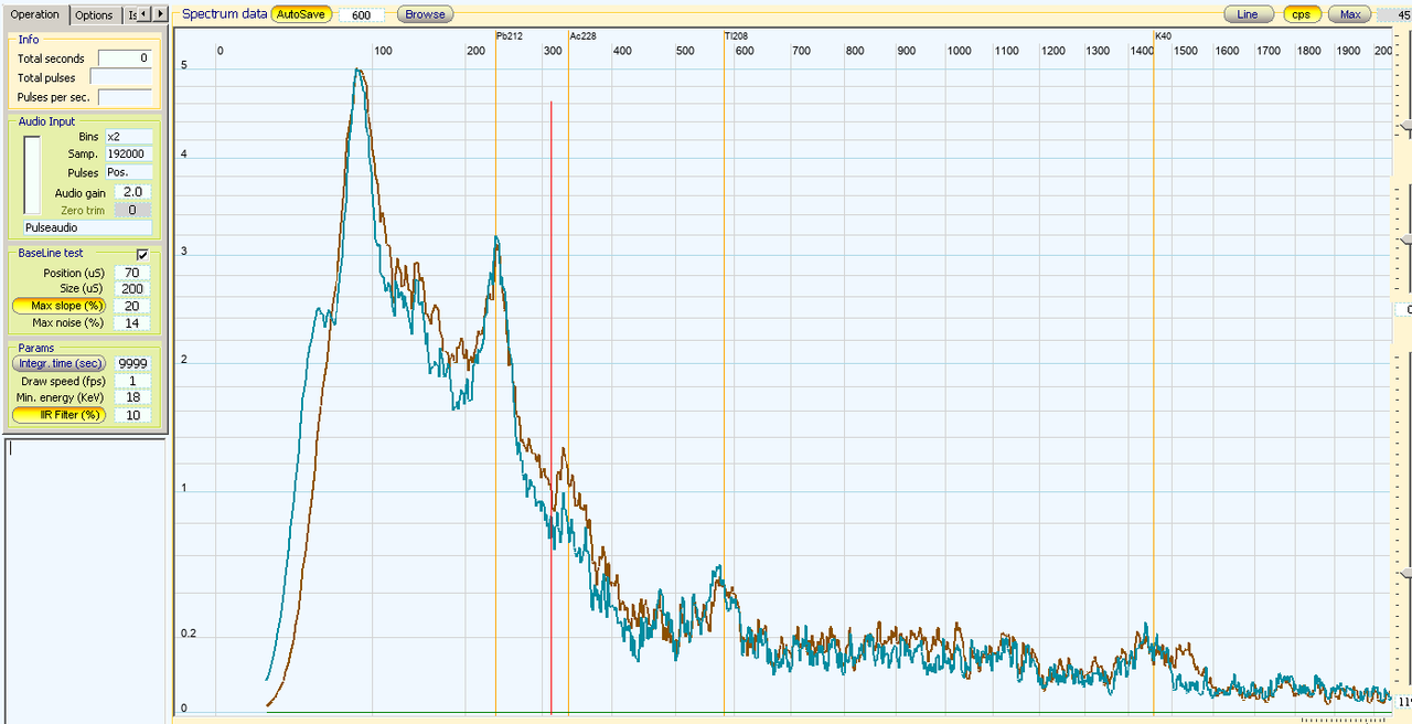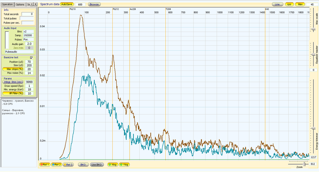 И двете са с изваждане на фона и измервани в продължение на 8 часа, гранитът от Банско има 3 пъти по-висока активност от варовика (което е малко честно казано). За съжаление "красивите" изглаждания с IIR филтъра не са налични при зареждане на запазени спектри в Theremino MCA поради някаква неизвестна причина и това изглежда грозновато....но пък и съвсем истинско. Специално варовикът е с много ниска активност, само 2.1 CPS - ако искаме красив и гладък спектър, ще ни трябват вероятно поне 24 часа, съдейки по гранитния спектър, вероятно и още (фонът също трябва да го "съберем" за повече време - ползвал съм записан само за 4 часа фон). Изважданията ги правих със саморъчен питонски скрипт, Theremino MCA позволява изваждане на фона, но не позволява експортване на резултата, което е много тъжно. Определено му липсват някои полезни функционалности.
