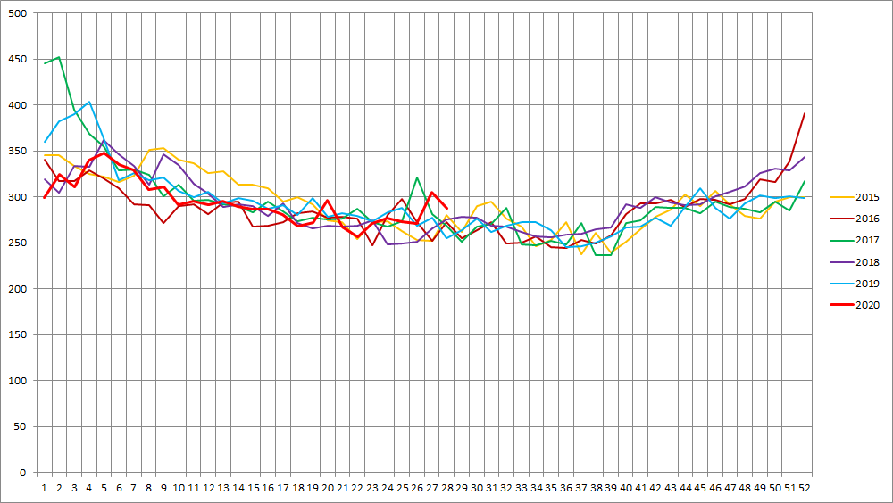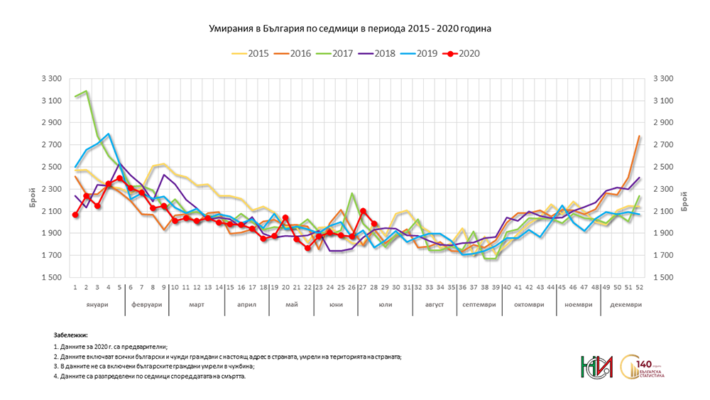 Тук бих искал да отбележа, че 28-та седмица на 2020 г. е с по-малък общ брой умирания (1986) в сравнение със същата седмица на 2015 г. (2006 умирания), ала намаляващия брой на населението води до размяна на местата съответно с 288 на милион през 2020 г. срещу 280 на милион през 2015 г.