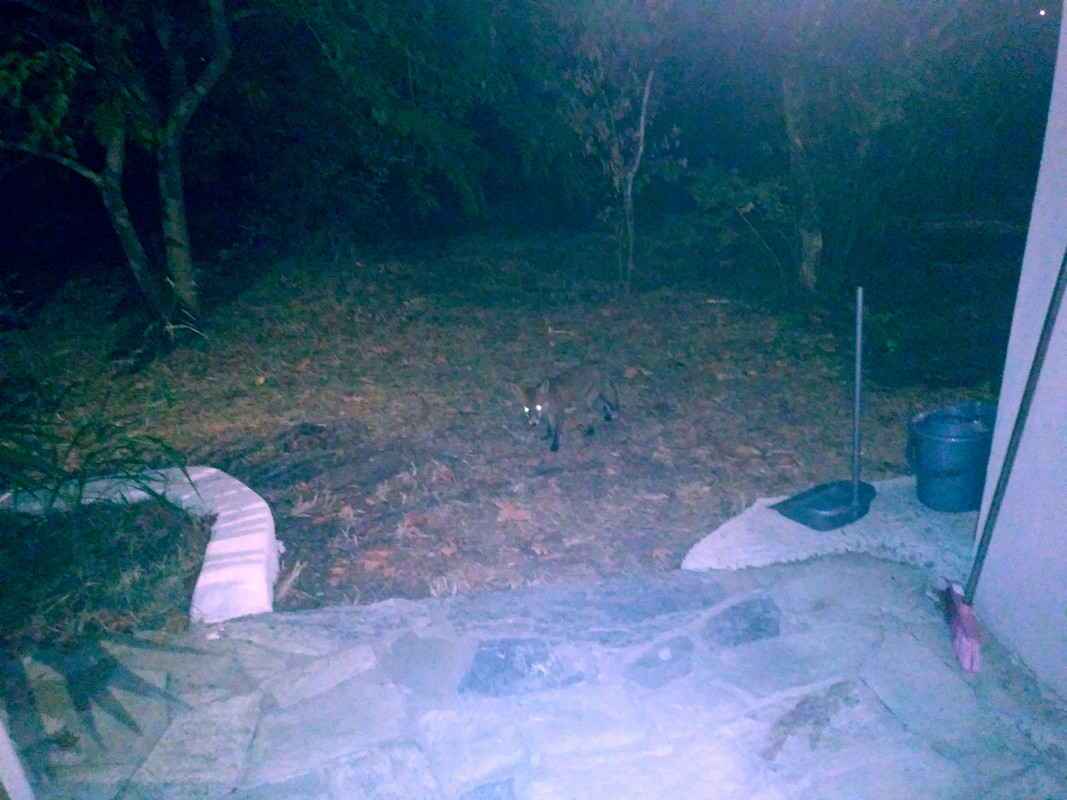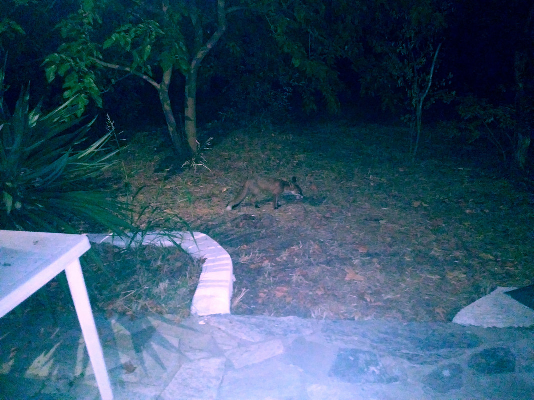 Чух че нещо шумоли, с периферното си зрение мернах куче, не е чак толкова необичайно някой да си е изпуснал кучето....обаче с тази опашка сложно. Животното изглеждаше по-малко уплашено и изненадано от мен. Дойде буквално на 2 метра от мен и ме гледаше....абе като домашно животно направо. Влязох, взех шунка от хладилника и му хвърлих. Изяде я. Стоя още малко. Аз се присетих че лисиците носят бяс и малко се притесних, но животното е тактично, ако рязко се приближи и аз се дръпна и то се дръпва. Изяде ми всичката налична шунка. Ще видим дали ще се срещнем пак, но като цяло съм доста учуден. Абсолютно никакъв страх няма от хората и е едно игриво такова.