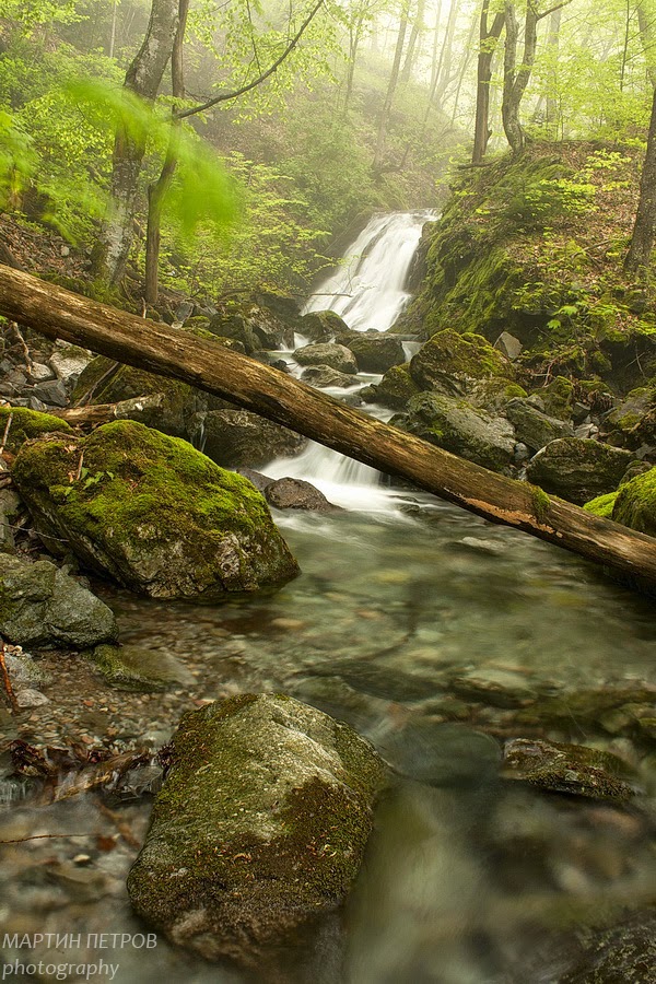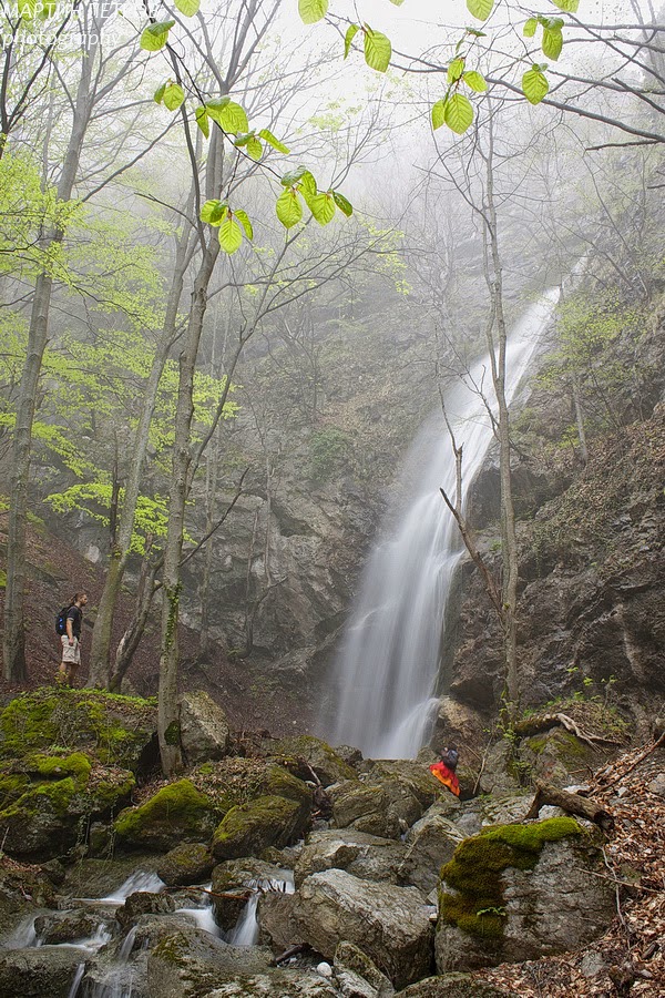 С подход през местност Барата покрай Курудере в резерват Соколна сме правили планински преход до водопад Скока в Кюйдере, по което поехме сега. Този път обаче сметнахме, че ще има мегдан за интересни пролетни снимки със зеленина в мъгливата гора, а и ни беше любопитно какви ли красоти се скътават от любопитните ни погледи по самата река... Непристъпните каскади занадничаха към фотообектива след всеки следващ завой.