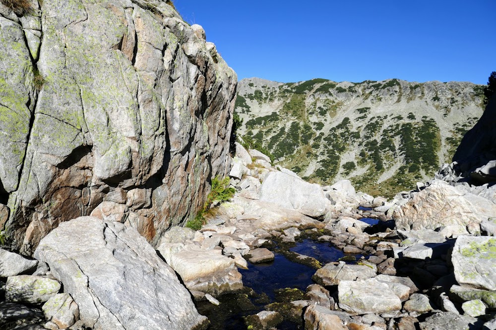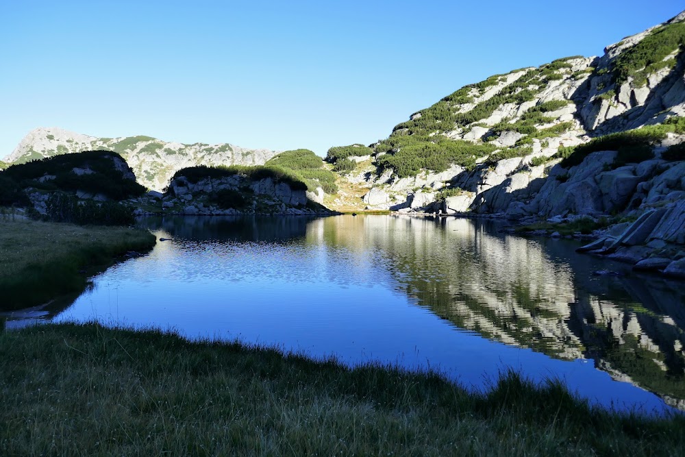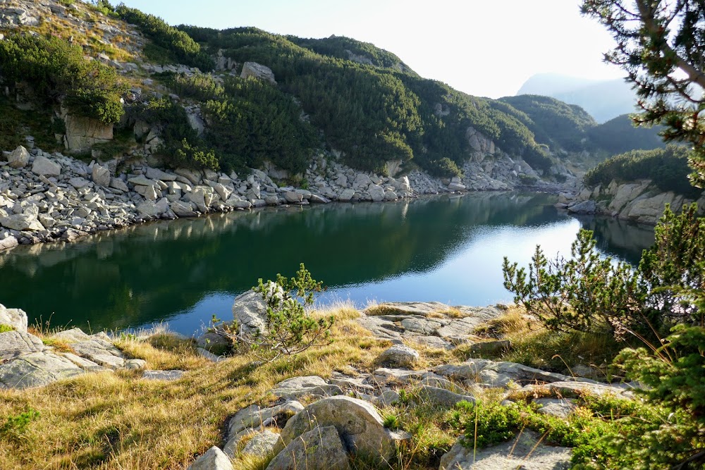 Това езеро е слабо посещавано, защото отгоре над него е камъняк, а пътека надолу през клека не можа да се нацели, а май и няма такава, като се загледах изотдолу. Клекът отначало беше поносим, но после се сгъсти и се наложи да нося Дара. Когато и това стана невъзможно, пуснах я самостоятелно. Тя си мина отдолу, под клоните, толкова бързо и леко се шмугна, като на разходка, изчезна за секунда. Чакаше си послушно долу на поляната до Банските езера, догато аз пуфтях още маса време през клоните. А...ааа...не е честно така😀