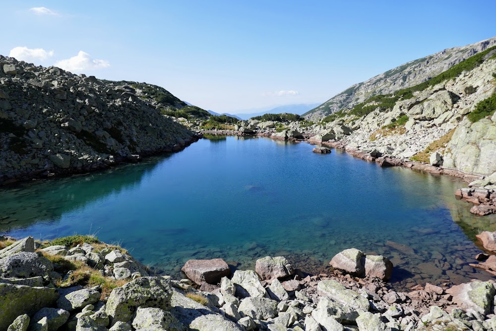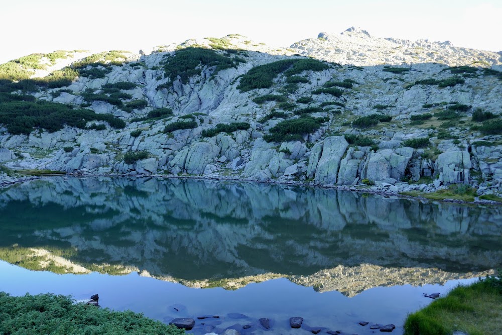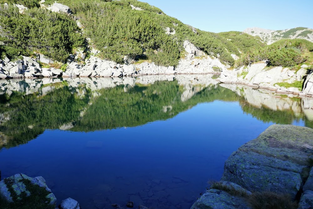 Отидохме в най - тясната част на езерото , видна горе на сьемката, където има малко тревичка, точно метър на два. Последният път, когато бях тук, преди 9 години, го преплувах туй езеро. Въпреки че е високо, второто по височина в Пирин, се нагрява доволно. И сега беше топло, но вече не смея...