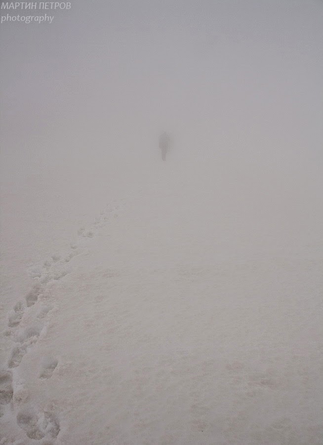 Истината е, че доста обмислях как точно да опиша и да отснимам ситуацята по времето на предхода за да я пресъздам най-точно, но някак си не може да се добие представа за случващото се в действителност. Непрогледната мъгла със свирещ вятър, зъбещите се непристъпни дерета пълни със сняг и отвеси, около които се движехме в нещо като една безкрайна пустиня от долини и тишина...... Само вятъра, напредващото време и настъпилата умора от преодоляването на близо 1900м. възходяща денивелация засилваха мобилизацията ни да се измъкваме колкото се може по-бързо, за да не отъмнеем принудително в тези земи...