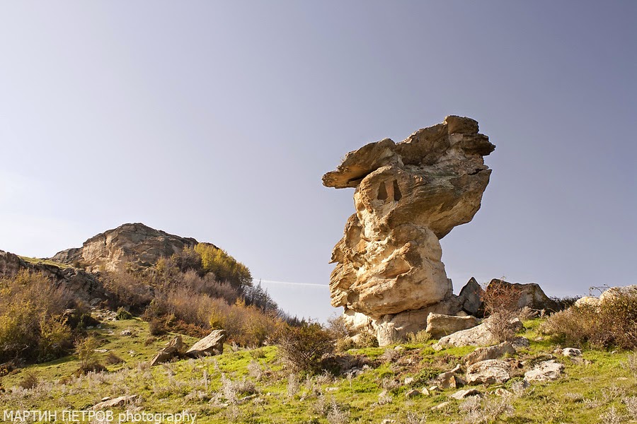Скалната гъба вляво, под която застанах бе с внушителни размери. Излъчваше хладина и скриваше слънцето. Отсреща са скалните ниши от горните кадри, по които слязох в подножието им и Скалната гъба.