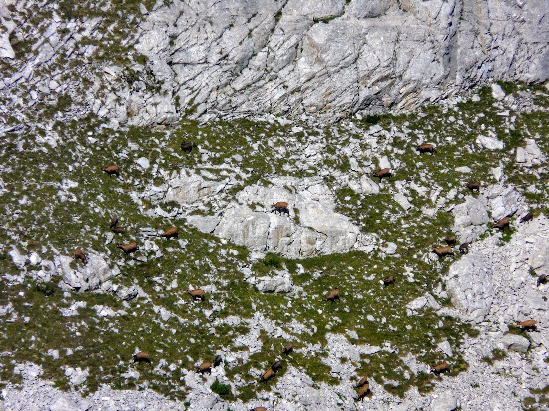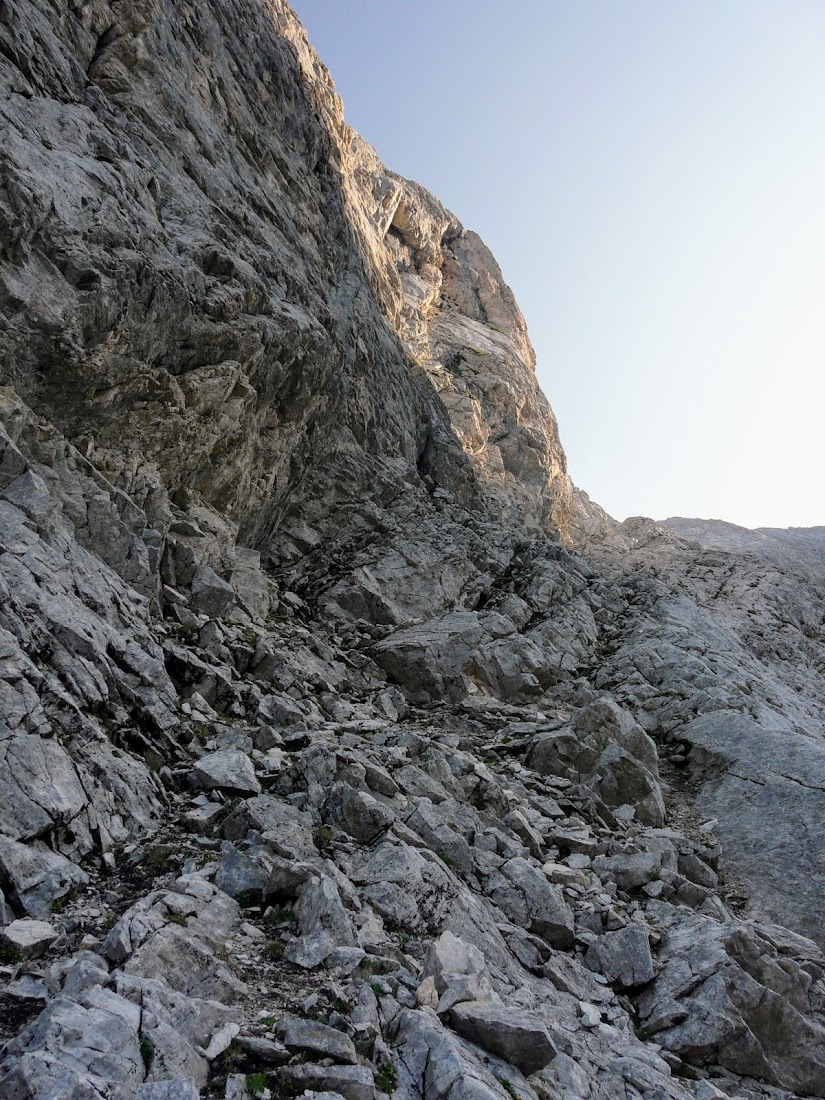 Този път решавам, за разлика от преди месец, да следвам друго, по-високо разклонение на козята пътека. То забива в много стръмният ръб на Източната стража. През един ситен и лесен за преминаване клек, който тук даже помага да се задържаш на големият наклон, пътечката на козите е незабележима, по средата на фотката:
