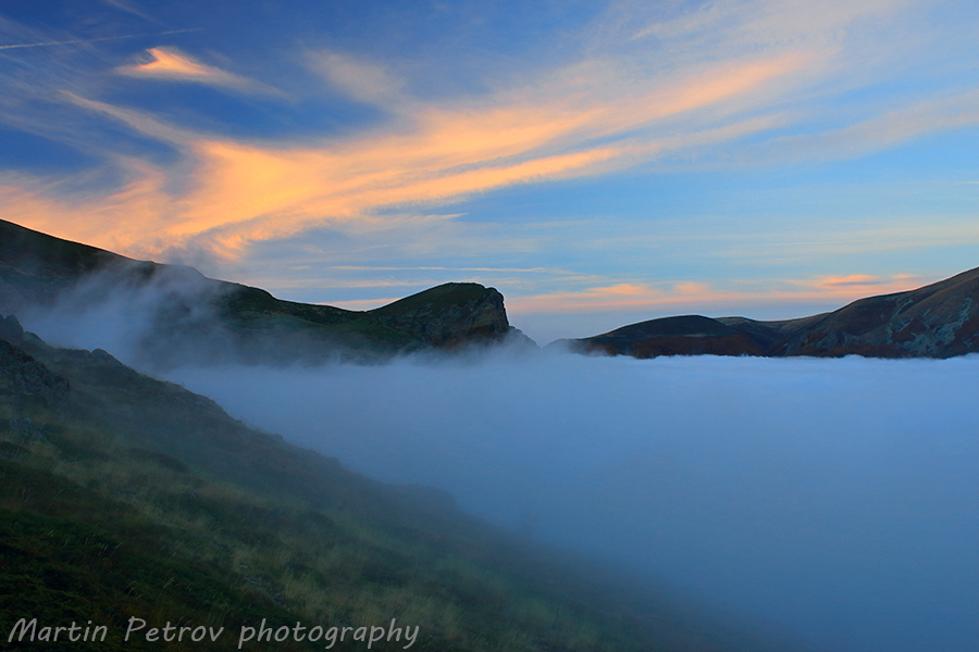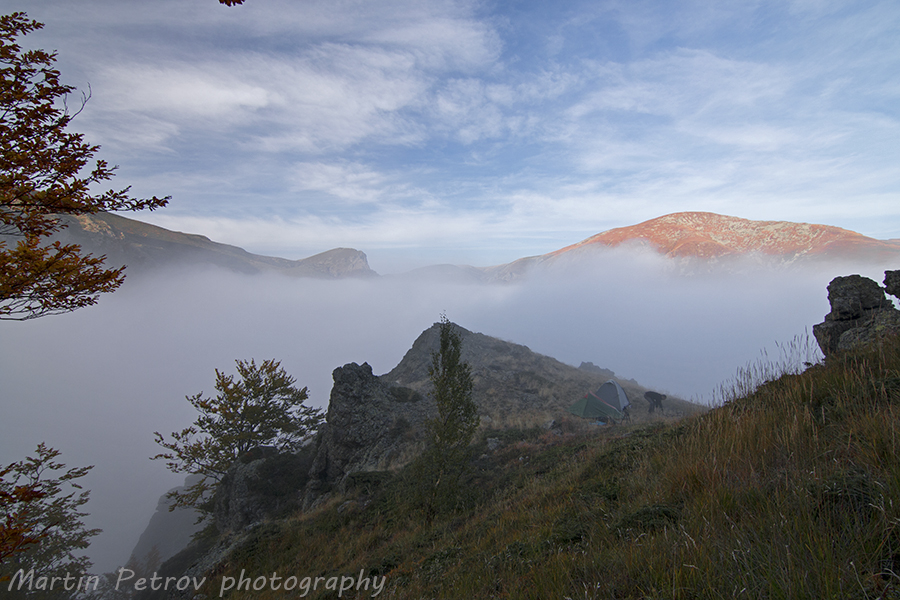 Изгрев нямаше, поради гъстата мъгла, но все пак успях да запечатам малко от слънчевите опити за пробив през облачността. Връх голям Кадемлия бдеше над цялата тази красота с мощната си снага.