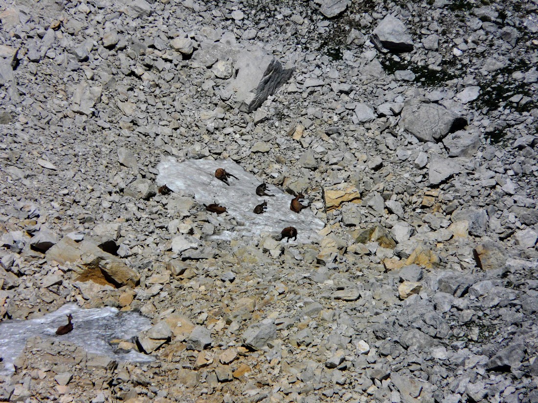 Започнах да се оглеждам за място за чувалуване. Харесаха ми едни треви на 2-300 м. под заслона. Последните туристи слязоха от върха, но тогава от всички посоки наизлезе много народ от диви кози, които се заеха да пасат тия треви, без много да се притесняват от мен. За да не им преча, пък и да не ме настъпи някоя от тях по ушите през нощта, съзрях една рехава тревичка метър на метър, която не представляваше интерес за добичетата, точно под моренният вал на снежника, и се курдисах на нея.