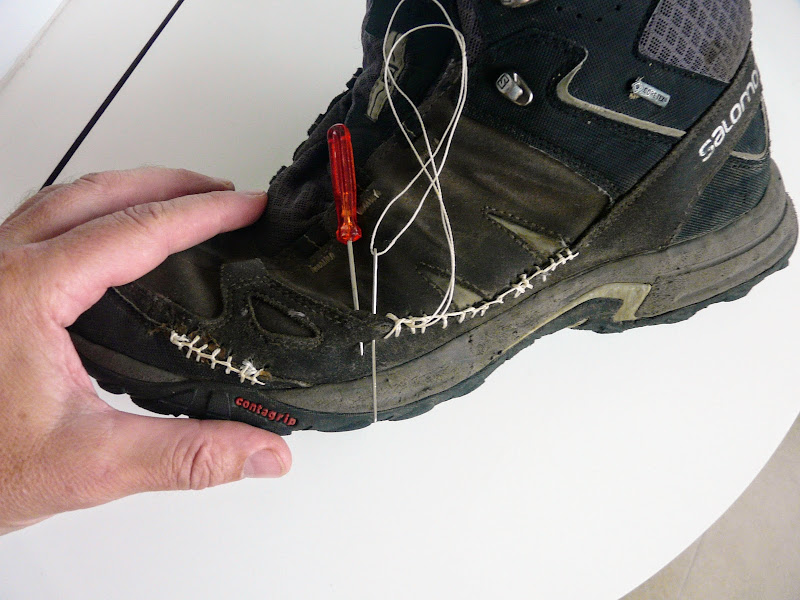 Обувките .....няма такива, има Ужасът на подобието на обувки, който няма как да бъде променен, и това си е. Но тази подметка няма равна на сцепление, не е важно че грайфера е изтрит, гумата прави сцеплението, и не мога да имам доверие на нищо друго, че ще ме преведе през набелязаните скали. Затова новият Вибрам фаща прах, а аз кърпя ли кърпя....