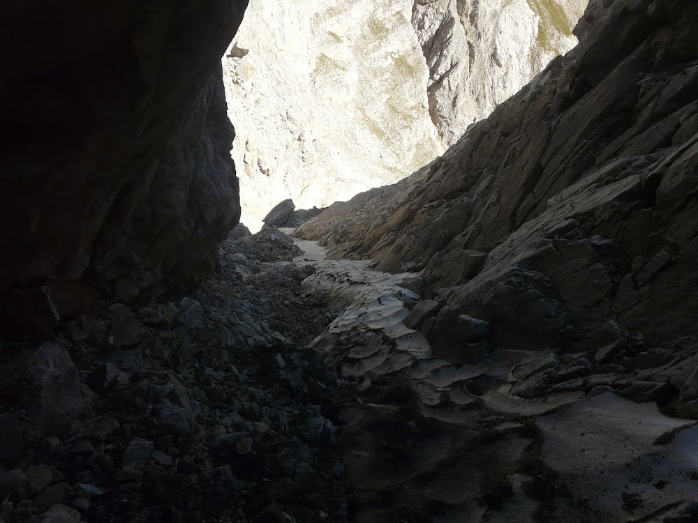 Влизам в процепа, в самото му начало, поглеждам - точно 12 часа е, по случайност ли, що ли, но дойде дванайстият час значи, разбираш ли ... . Както и на Вихрен, и тук преминаването няма как да стане по дъното му, което изглежда по- равномерно, но ако стъпиш на него е подвижно – току виж тонове камък ме повлекат в нищото.