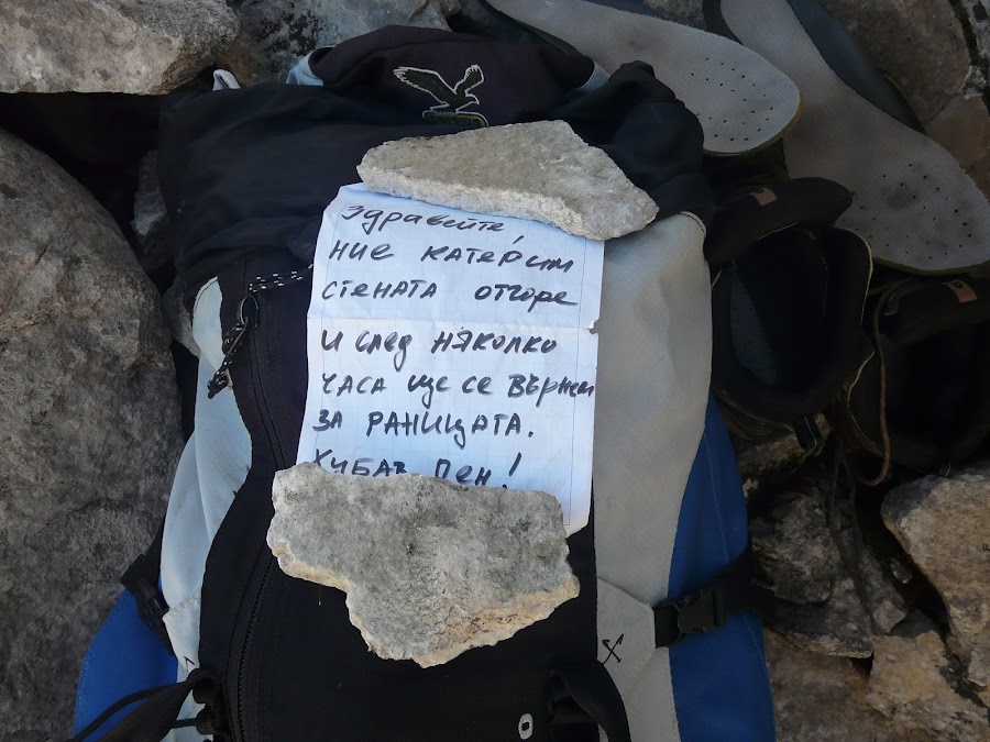 Когато се намери хубаво българско име на един връх, то си се налага само, не като разни Кривеци, Главници и Желязници....Сутринта станах рано, но първо пристегнах малката раница с едно яке и 1 литър вода в нея. Тя ми служи повече да сваля и сложа вътре излишните дрехи, когато стане топло по-късно през деня.. Другата й важна задача е, да нося празни бутилки за вода, за да насипвам в тях сняг по пътя, тъй като не искам още отначало да тръгвам с 3-4 кг тежест във вид на вода. Голямата раница оставих под един надвес на скрито място, но все пак с бележка, тъй като може някой да я намери, да се притесни, че човек се е изгубил или нещо друго се е случило: