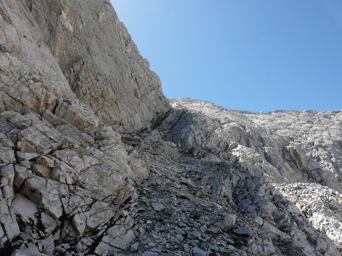 Още колко път ме чака...Тук преминавам от другата страна на брега / не в оня смисъл от албионският анекдот, исках да кажа отсреща на десния склон на улея/ и лесното свърши. Отново подхващам скалите, този път отдясно и на слънце.От Кончето има видимост към мен и току се дочува : Гледай, гледай отсреща има чиляк ! Остави го , тоя е луд ! - и подобни, които ме развеселяват, но не отговарям и дума - няма смъсъл да споря и въобще излишно да се вика в планината, даже заради козите, които много се плашат завалиите. След като бях свидетел преди два дни на дълъг спор с псувни от човекопитеци, застанали на връхните точки Вихрен и Кутело-успяваха бе, чува си се, половин час не се умориха да крещят и пустосват между върховете пред стотици други ора.