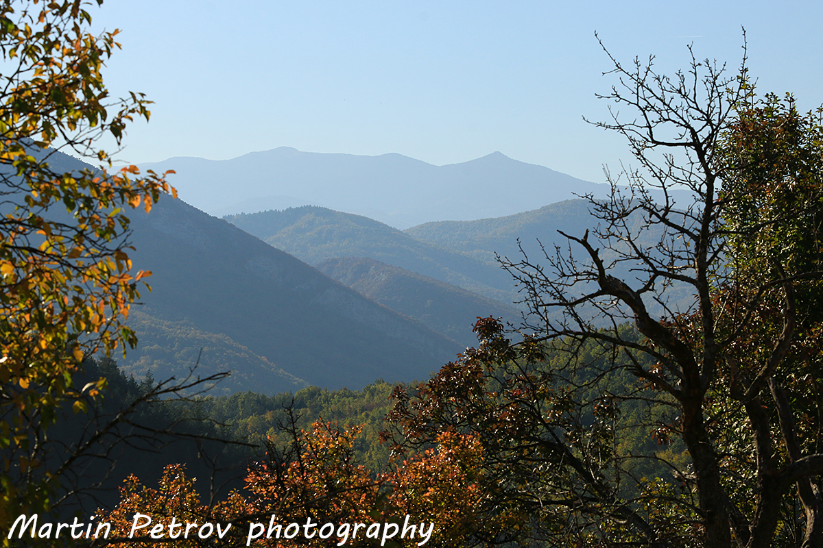 Панорамен изглед от църквата към Миджур и острия Обов връх, които ни посрещнаха по изгрев от връх Ведерник.