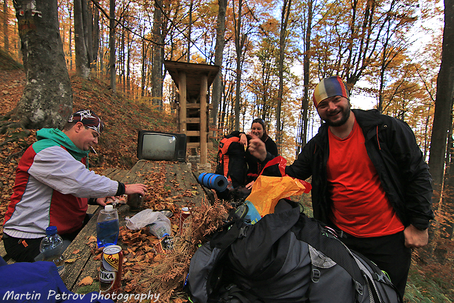 Завършихме и направихме разбор на събитието в крайпътно заведение под Балкана с шкембета и бири. Беше ни топло по тениски, за разлика от вчерашния ден, когато тръгвайки от тук не виждахме пред краката си в гъстата мъгла, придружена от неприятен северен вятър... Балканът ни допусна в красивите си есенни гори, получи се поредната приятна двудневна разходка в още по-приятна компания...