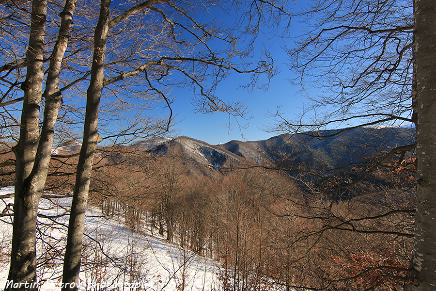 По пътеката, която, както очаквах е много красива. Обикновено се преминава за 3-4 часа, но ми бяха нужни близо 6, докато стигна в хижата. Редуват се гъсти и рехави гори с малки билни поляни, разкопани като кратери от горските прасета. Освен тежкият багаж, който ме смазваше по стръмнината (в раницата имаше зимно оборудване за спане на открито - палатка, спален чувал, лавинна лопата, снегоходки, пухени дрехи, примус, термос, статив, храна, брус сланина и отделно фототехниката), се наложи да проправям пъртина в мек и кишав сняг, който след излизането от рида беше на навеища. Раницата и фототехниката да закотвяха 30-е кг и проклинах цялата тази лудост за пореден път, а и бях сам. Имаше нужда от импровизации с нападалите дървета, горска забава.
