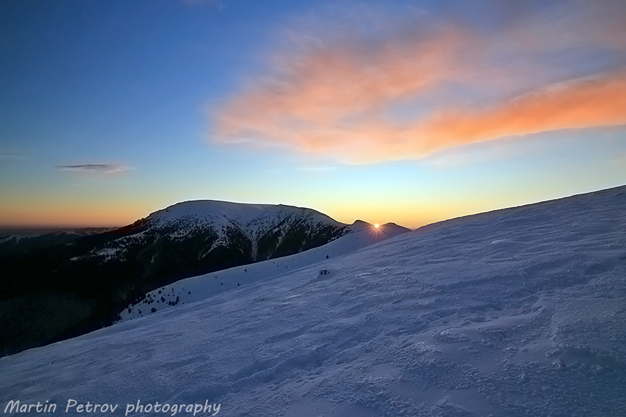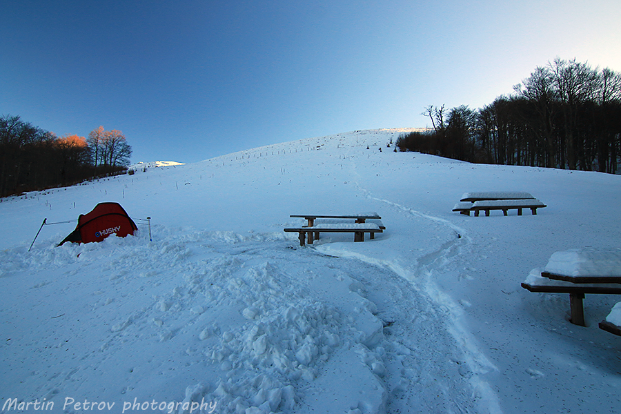 В непосредствена близост до хижа Бенковски ме хвана залезът. Бях много изморен. Престараването с багажа може да се каже, че е добра идея за зимната планина, но може да изиграе лоша шега. Желанието за изгрев от билото взе да се изпарява.