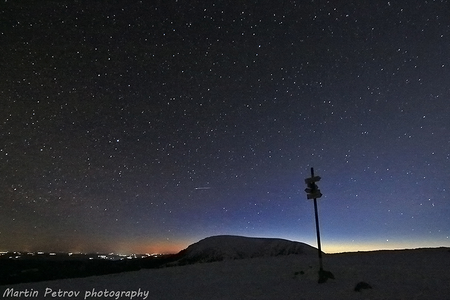 Излезе пронизващ вятър, който с излизане в откритите у-ци се усили. Грубите сметки показваха, че в това състояние на снега, горе ще съм поне час преди изгрева, затова вървях много бавно и спирах постоянно. Изключвах челника неведнъж и наблюдавах черното небе, обсипано с милион искри, тъмните силуети на грамадни била и малки градчета и селца, с пушещи комини в ниското. Дори при ходене, студът се усещаше, което е сигурна предпоставка за неприятен престой горе или още по-лошо - да се наложи да слизам...