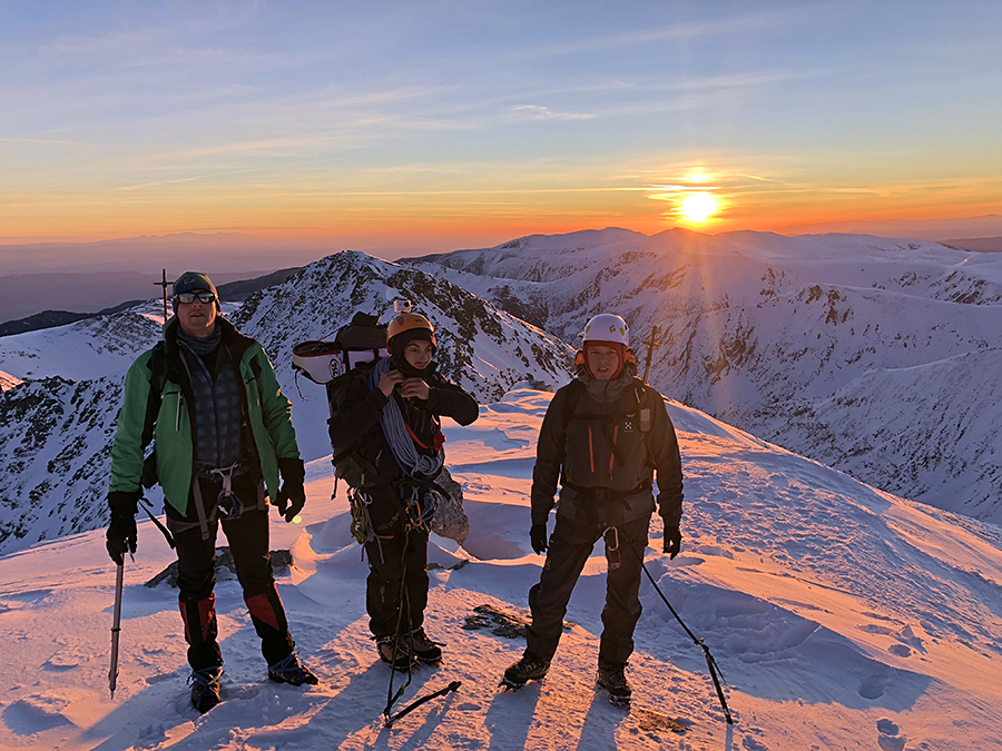 Изгревът беше красив, а денят обещаващ за траверс през ръб Трионите. Снегът обаче беше навят лошо, нестабилен и през целия ден се свличаха малки дъски, които ни бавиха и налагаха използването на страшната дума - въже и правене на осигуровки.