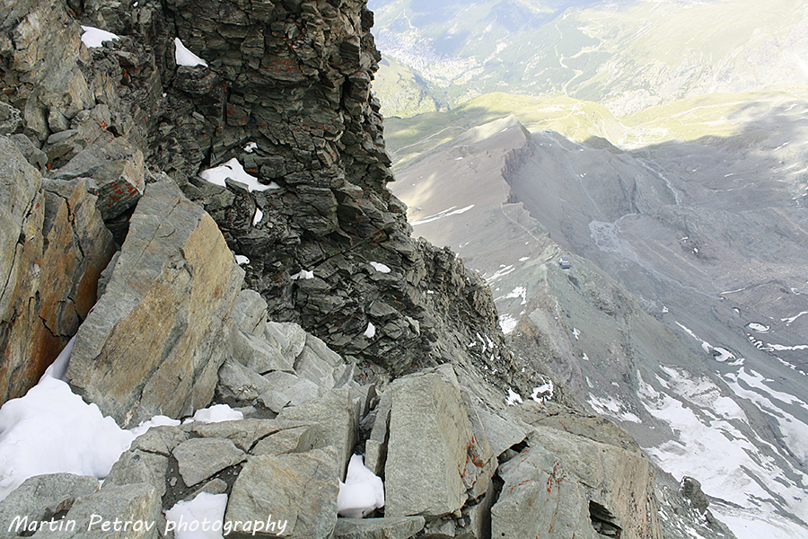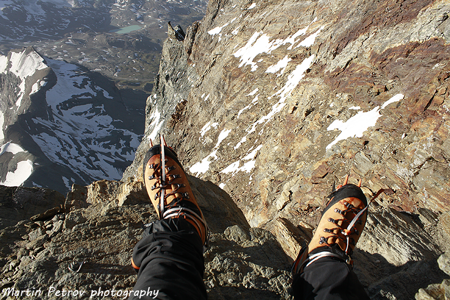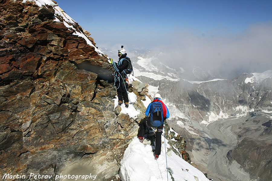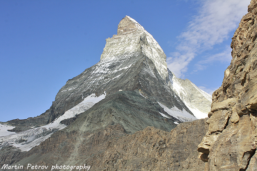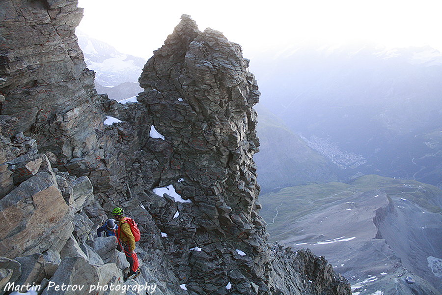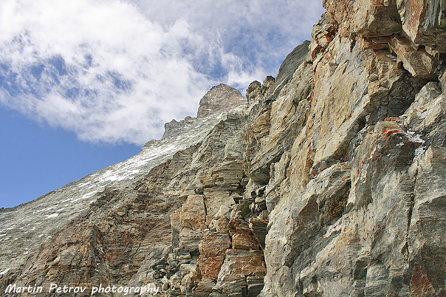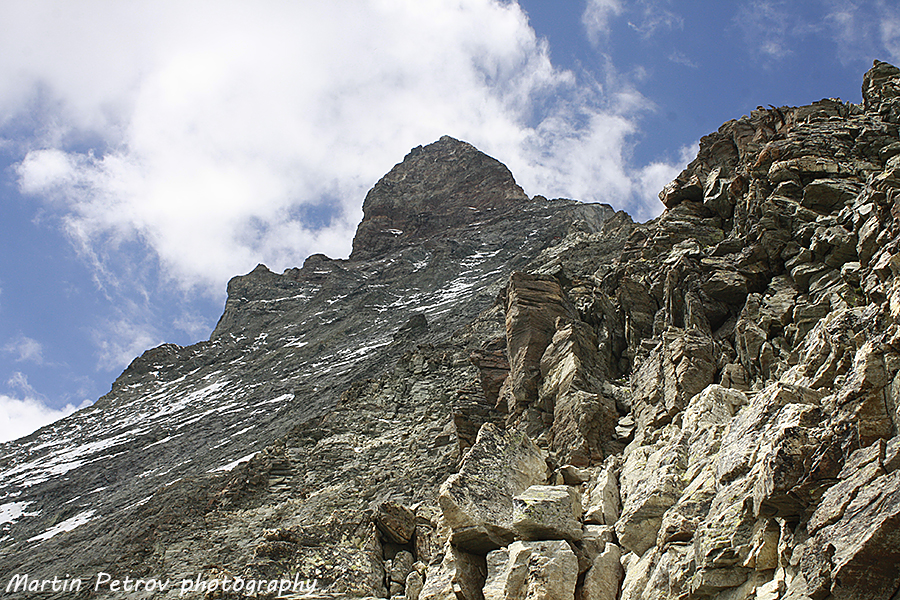Връх Матерхорн - 4478м.н.в. се извисява самотно в небесата над курортното градче Цермат - Швейцария. С перфектната си триъгълна форма, пробождаща страховито небето, той често е изобразяван в детските рисунки. Преди, около три месеца с приятел, решихме да се пробваме по маршрута през хижа Хьорнли, доверявайки животите си един на друг. Дори обмисляхме траверс през италианския ръб и слизане в Швейцария. Знаехме, че ще е много трудно. Върхът има жестока репутация - над 500 жертви, което го нарежда на 6-о място в света по лошата скала . От изкачените най-късно в алпите е. С много смъртни случаи. Масивните стени изливат десетки камъни, ръбовете слизат в дълбоки кулоари. Северната стена на връх Матерхорн е обект на много спортни изяви. Извисяващ се самотно, връх Матерхорн е генератор на бури и лошо време. Аз се заех не на шега с всичко и започнах да тренирам ударно: бягане, набирания, лицеви опори, катерене, множество рапели в труднодостъпни ждрела на Стара планина. Последното доведе до нелека травма и лошо навехната ръка. Направих няколко сериозни изкачвания с 2000 + денивелация в нашите планини. Отслабнах и влязох в почти добра форма. Проучвахме тракове, точки, оглеждахме ръбовете със сателитни снимки, изгледах над петдесет клипа, по които в последствие открихме бързо губещия се иначе "път". Главата ми беше заета с мисълта денонощно. Къмпинги в Таш, лифтове, влакчета... От лифта под хижа Хьорнли, се преодоляват 2000 метра денивелация до върховата кота на красавеца Матерхорн. Изключително изтощаващо катерене по нестабилни скали и в комбинация с височината му е нужна аклиматизация. Направихме аклиматизационно изкачване на връх Брайтхорн - 4164м.н.в. На другия ден атакувахме и според стабилната прогноза успяхме да се изкачим и слезем до Цермат, но не на всяка цена.