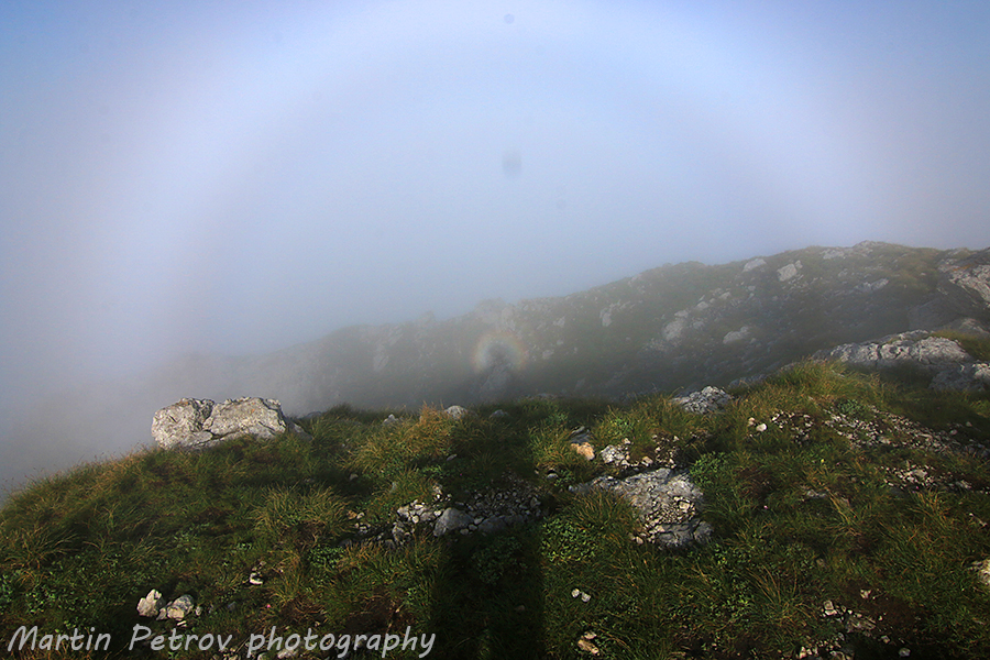 Появи се и Брокенският призрак. Явление, което виждам за втори път. Брокенският призрак е придобил известност благодарение на връх Брокен в планината Харц в Германия, където постоянните мъгли позволяват често да се наблюдава това явление. Слънцето пробиваше мъглата зад нас и отразяваше ефектно фигурите ни на склона отсреща.