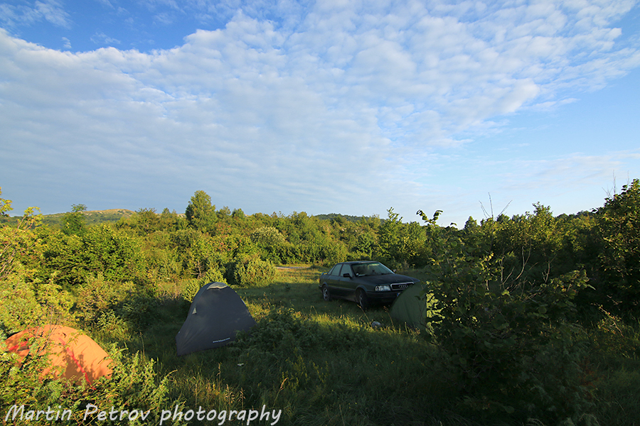 Поляната и бивака. Топлата бира нямаше сама да се охлади, но все беше бонус след успешния ден. Надморската височина в поредния планински проход е 1100 м. Скоро температурата рязко спадна, слънцето се скри бързо и топлият чувал веднага влезе в употреба.