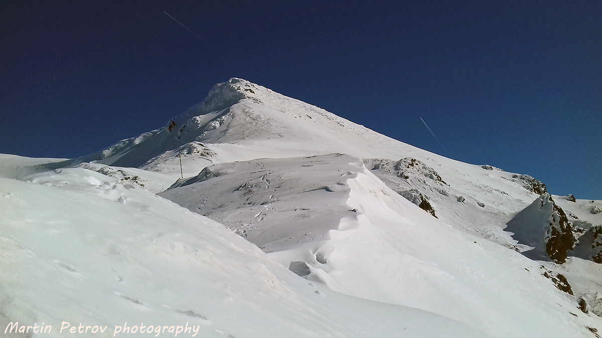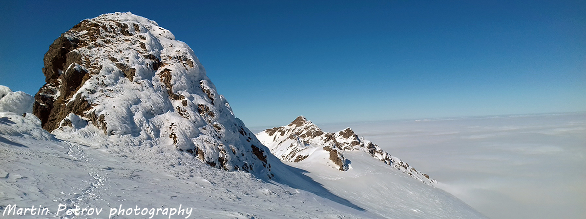 В подножието на връх голям Купен съм малко преди 7 ч. Гледката на запад е поразителна. Всичко се вижда на длан. В дъното белее могъщото било на връх Вежен - 2198 м.н.в. Котките и пикел са задължителни тук, а верен другар с въже е силно препоръчителен, но сега бях сам и сетивата ми бяха изострени. Всяка крачка тук може да е фатална, умората по сложното и продължително трасе се натрупва минута след минута и предпоставките за инцидент са налице. Маршрутът Добрила-Ботев в зимни условия се преминава за 10-16 часа, като има случаи-рекорди, но мен ми бяха нужни 10 часа. Тук, на връх Купена свършва и зимната колова маркировка. Оттук насетне всичко е пълна импровизация.