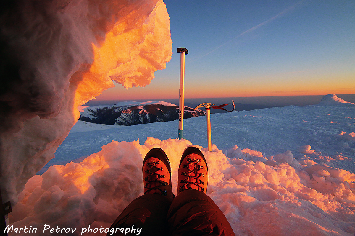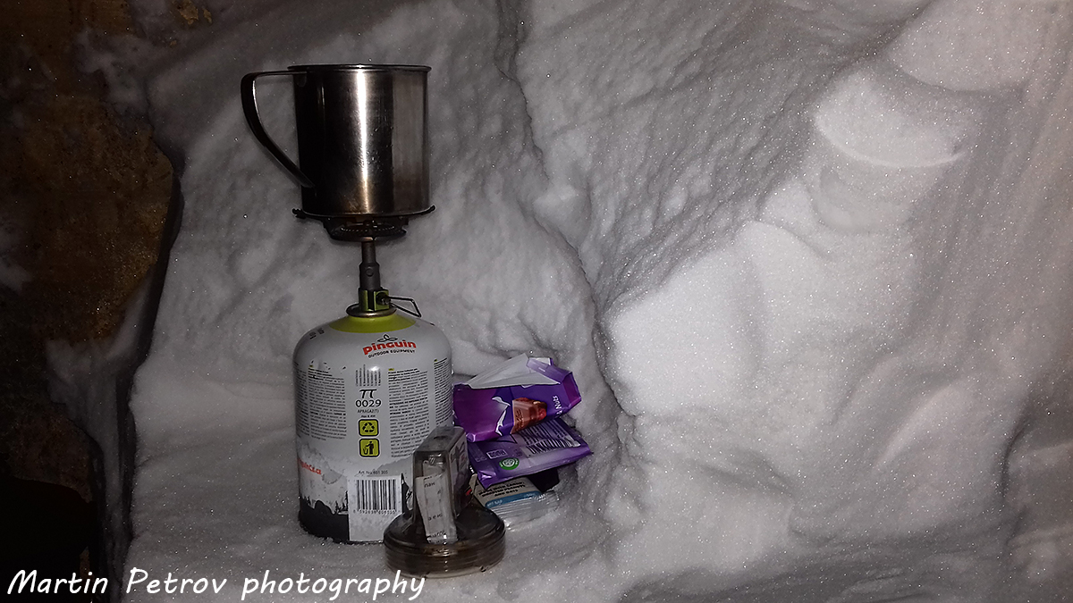 В ламаринената къщичка на връх Амбарица. Изкопах много сняг. Къщичката беше пълна догоре, но все пак създадох нужния уют. Две шалтета, място за импровизирана вечеря с горящ примус, топъл чай и ветровитите закачки на Амбарица и старопланинското било. С раници препречващи входа и хубавите спални чували, спокойствието и топлината са гарантирани, в пролуката между раниците - големите звезди и преминаващите самолети.