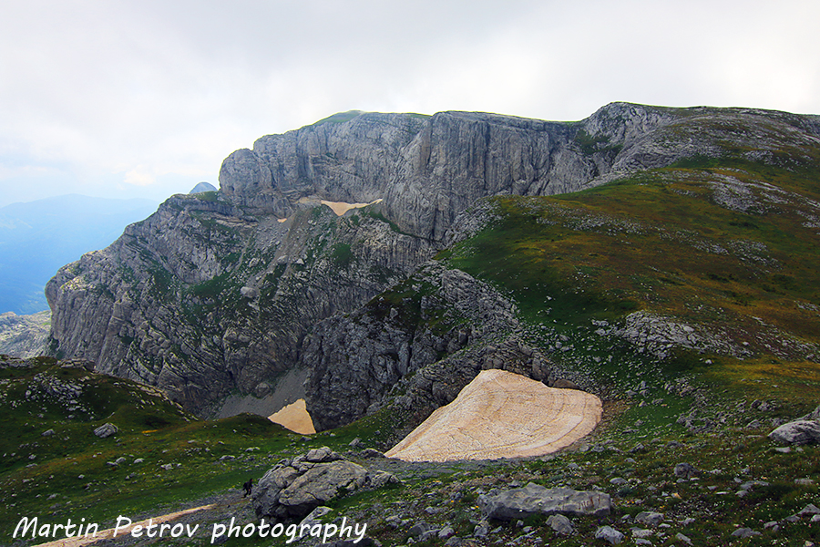 Вальо и Жоро ме следват по осеяните с цветя тревни площи, които са кът тук. Насреща е стената на връх Зла Колата. Маркировката на места се губи и трябва да се внимава повече.