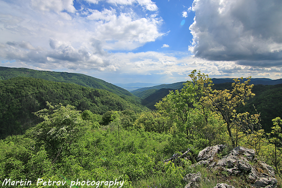 Панорамата на юг след излизане от гората. Твърдица остава много далеч. Около мен ухае на бели и лилави люлаци, попаднал съм в раят на цветовете.