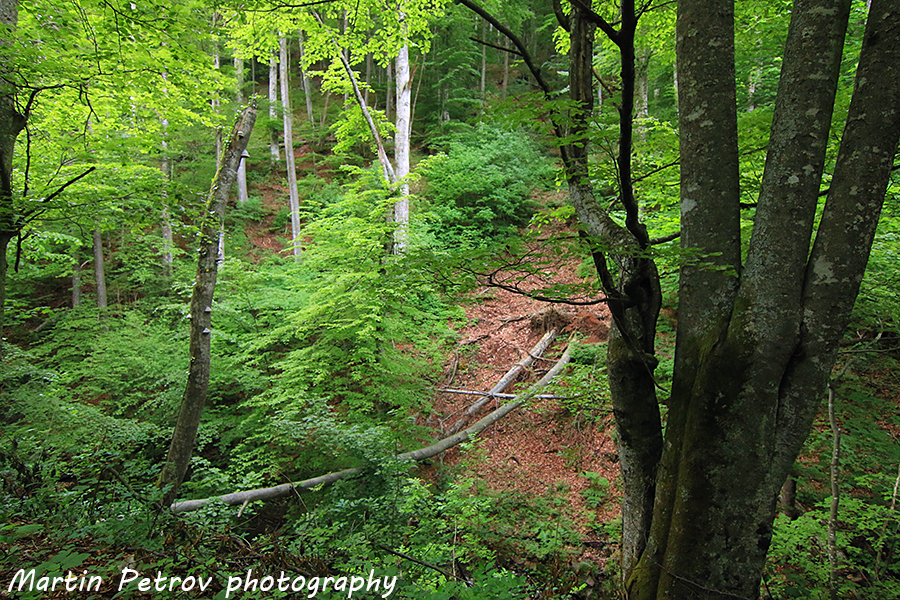 И все нагоре и напред! Гората взе да подсказва, че съм в Стара планина с буковете наоколо. Изоставям пътя, който сякаш няма край и подхващам оставащите ми 500 метра денивелация. Въпреки прекрасната зелено-бяла маркировка, по обраслите още от сега в края на май пътеки, си личи, че туризмът тук отдавна е мит. По калните пътища и пътеки няма и следа от отпечатъците на туристически обувки.