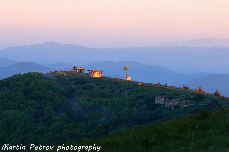Ясно се забелязва енергийният ветропарк в далечината и сливенския Балкан.