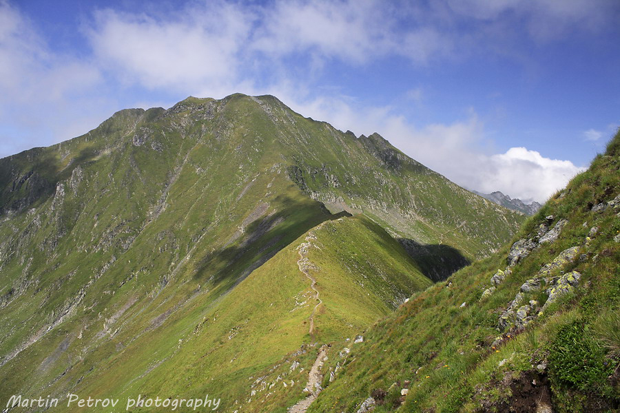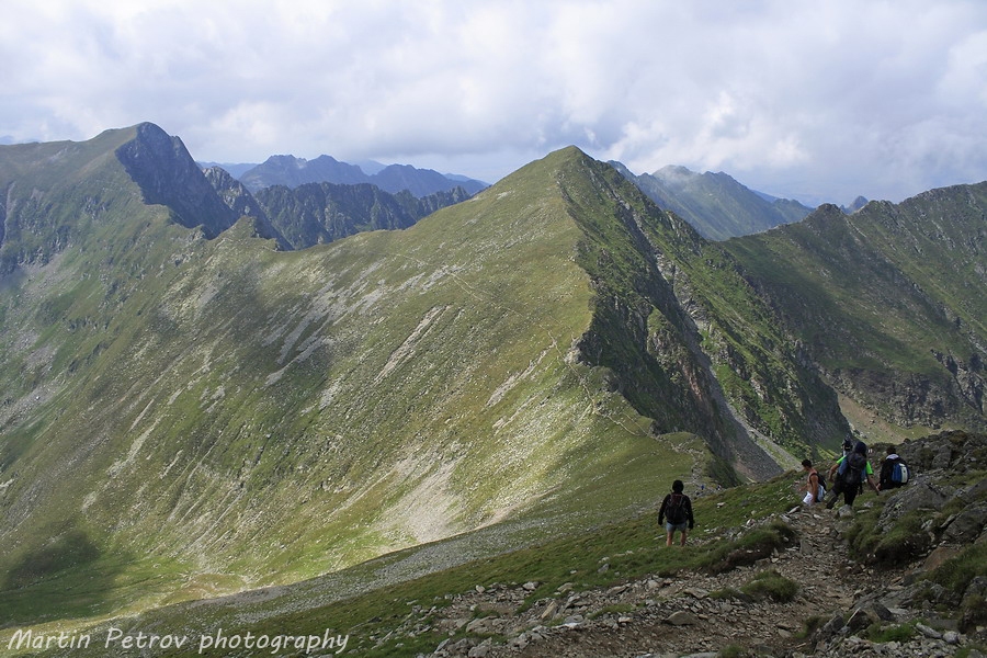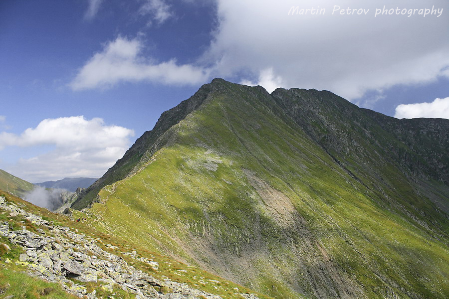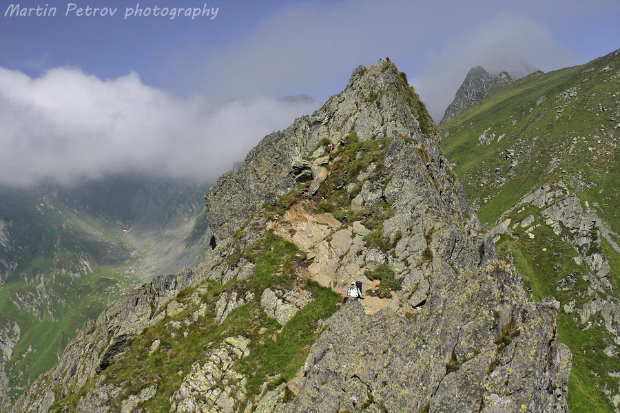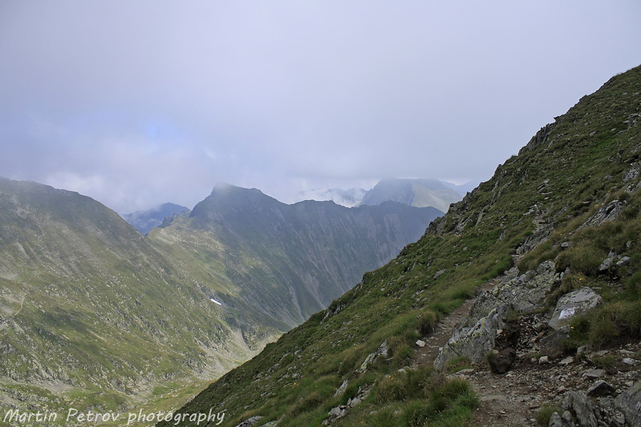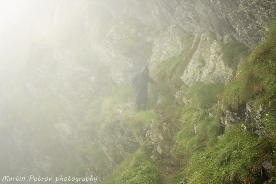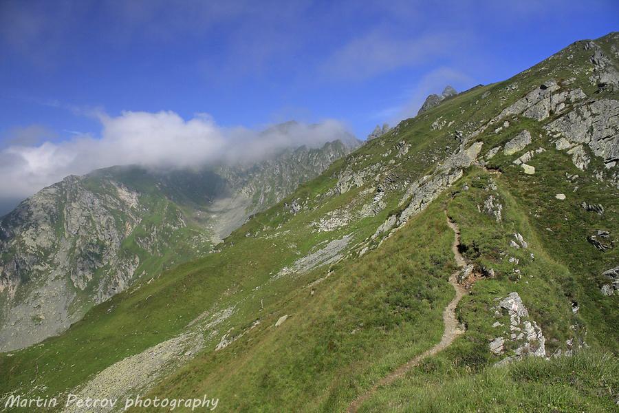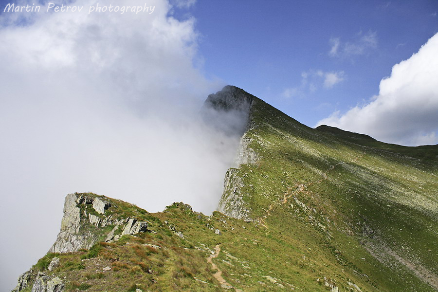 Билото към връх Молдовяну преди пагубното слизане. Молдовяну тънеше в облаци, мъгли и неизвестност. Часът минаваше един след пладне. Бях на предела на силите с тежката раница, а моят спътник беше още по-назад по пътеката. Знаех, че няма да се изгуби, поради коловозите на пътеката, уви изгубил беше малко пътеката изкачвайки връх Мирчо, но все пак се намерихме.