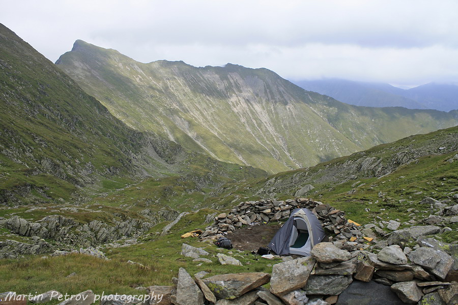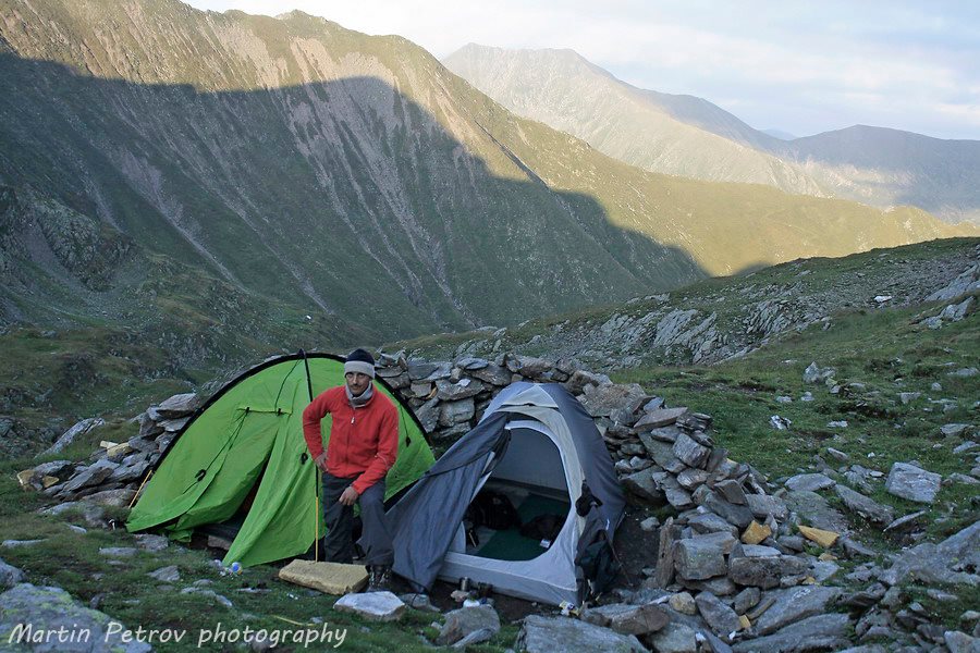 Аз с разпъната палатка, той с изпънати нерви. Подготвих си бивака. Знаех, че ако нещо се обърка по-късно и закъснея порядъчно, ще ме чака сигурно убежище, при влошаване на времето, особено важен елемент за оцеляване, когато човек остане без запас от сили. Сериозно укрепена палатка, изпънати като струни въжета, камъни против вятър в спалното помещение. Случвало се е да се гоним в мъгла с палатката. По-бърза е от мен, изпитано е!!! Smile Хапнах на две на три, бях доста изморен след пагубните изкачвания и слизания. Багажът може би отново надхвърляше поне 25 кг. Коцето дойде скоро, реши да не се подлъгва на болните ми амбиции и да изкачи върхът утре, щеше да си почине, да проучи изворите покрай езерцето, да се пребори с нахалните овце гледащи жално хрупкаво зелената му палатка Trimm (не си купувайте искрящо зелени палатки, създавате си сериозни главоболия с местната фауна!!!) . Водач с група му казали, че до връх Молдовяну има 5 часа в едната посока. Значи 10 в двете, при добро стечение на обстоятелствата, малко след полунощ щях да съм отново тук. Попитах друга група, потвърдиха уклончиво - поне 4 часа до връхната кота.