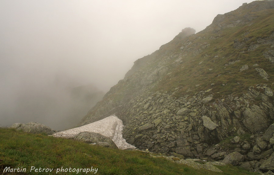 Около езерото Бъля, където паркирахме. Билото на планината тънеше в облаци, мъгли и дъжд.