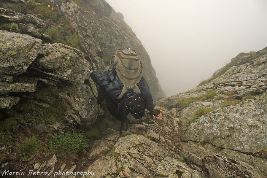 Срещнахме хора, разпознаха ме бързо от интернет средите и ми подариха снимка на слизане по улеите под Негою. Неизвестността в мъглата не ни попречи, все пак преди малко се качихме точно тук, по веригата. Единствено раницата, провесения апарат и напускащите ни сили внесоха малко дискомфорт.