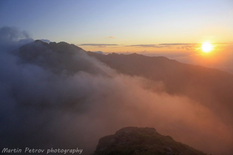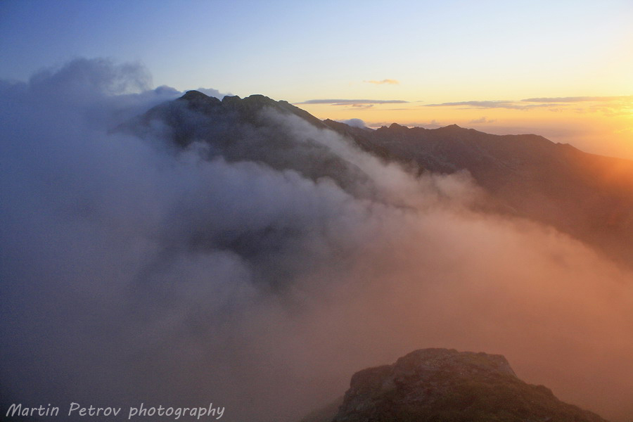 За не повече от пет минути, леден вятър прониза небето и премести за миг мъгли и облачни маси. Слънцето ниско докосваше хоризонта и палеше пейзажа. Залезът се случи тук. Цветовете изригнаха до такава степен, че почти ме докараха до лудост! Величествените върхове се показаха и в миг от целият този ден, всичко се случи сега.